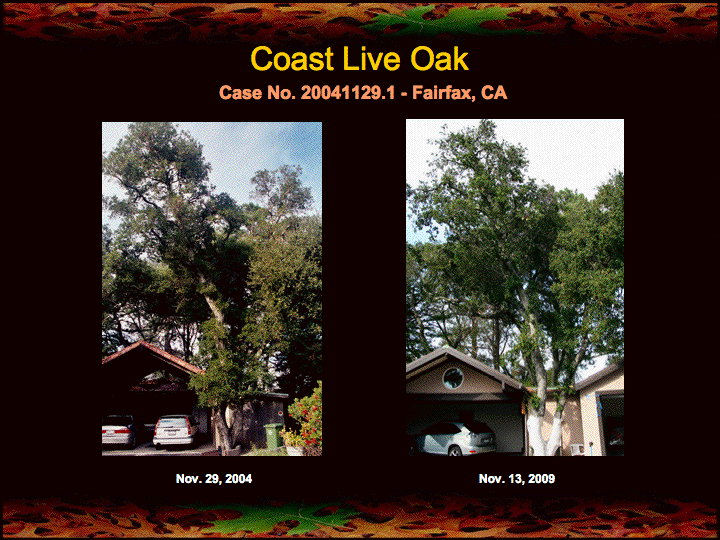 In the above oak (case no. 20041129.2) there is a brownish tinge in the canopy of the tree in the recent photo (on right). This browning is the result of a heavy crop of acorns growing on the branches.