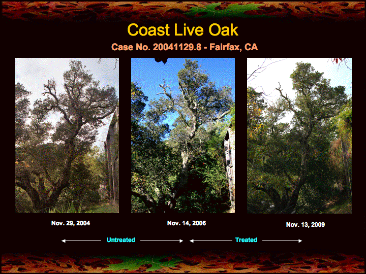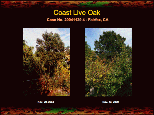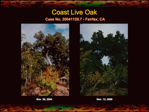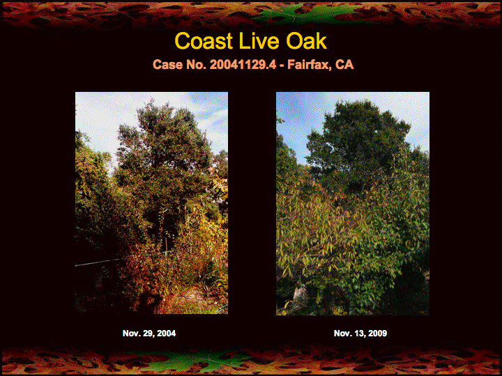 I have been reporting for some time on the progress of seven ill coast live oaks in Fairfax, CA first treated with fire mimicry in November of 2004 (see here, here, and here). These oaks have been under the care of my friend and colleague Leith Carstarphen of Ecologic Landscaping. Alan Mart has also contributed his time and expertise in caring for these oaks.