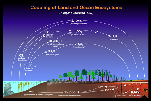 The data from Big Sur are consistent with the hypothesis that biogenic emissions from oceanic phytoplankton are oxidizing in the atmosphere and producing sulfuric and organic acids that fall as acid rain. Below is a schematic of some of the proposed reactions. Please see the original paper [1] for more details.