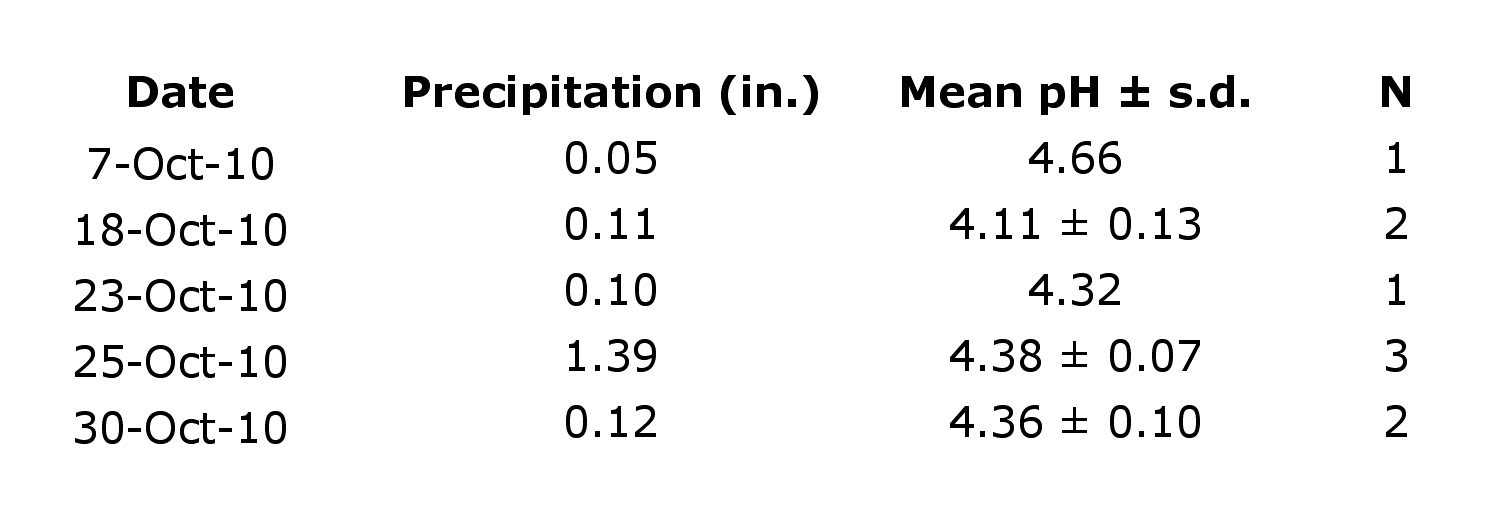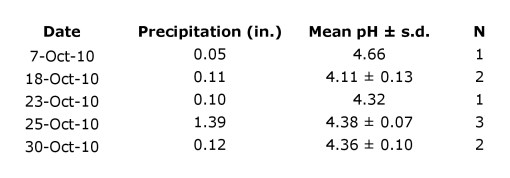 Other than the one large storm that hit last week most of the rainfall events in October were light. And they were the most acidic of any set of monthly readings since the start of the record in 2006. The rain pH of 4.1 measured on Oct 18 was the lowest pH observed in more than fours years of readings in Big Sur. The readings for Oct 23 (4.3), Oct 25 (4.4), and Oct 30 (4.4) were also unusually acidic.