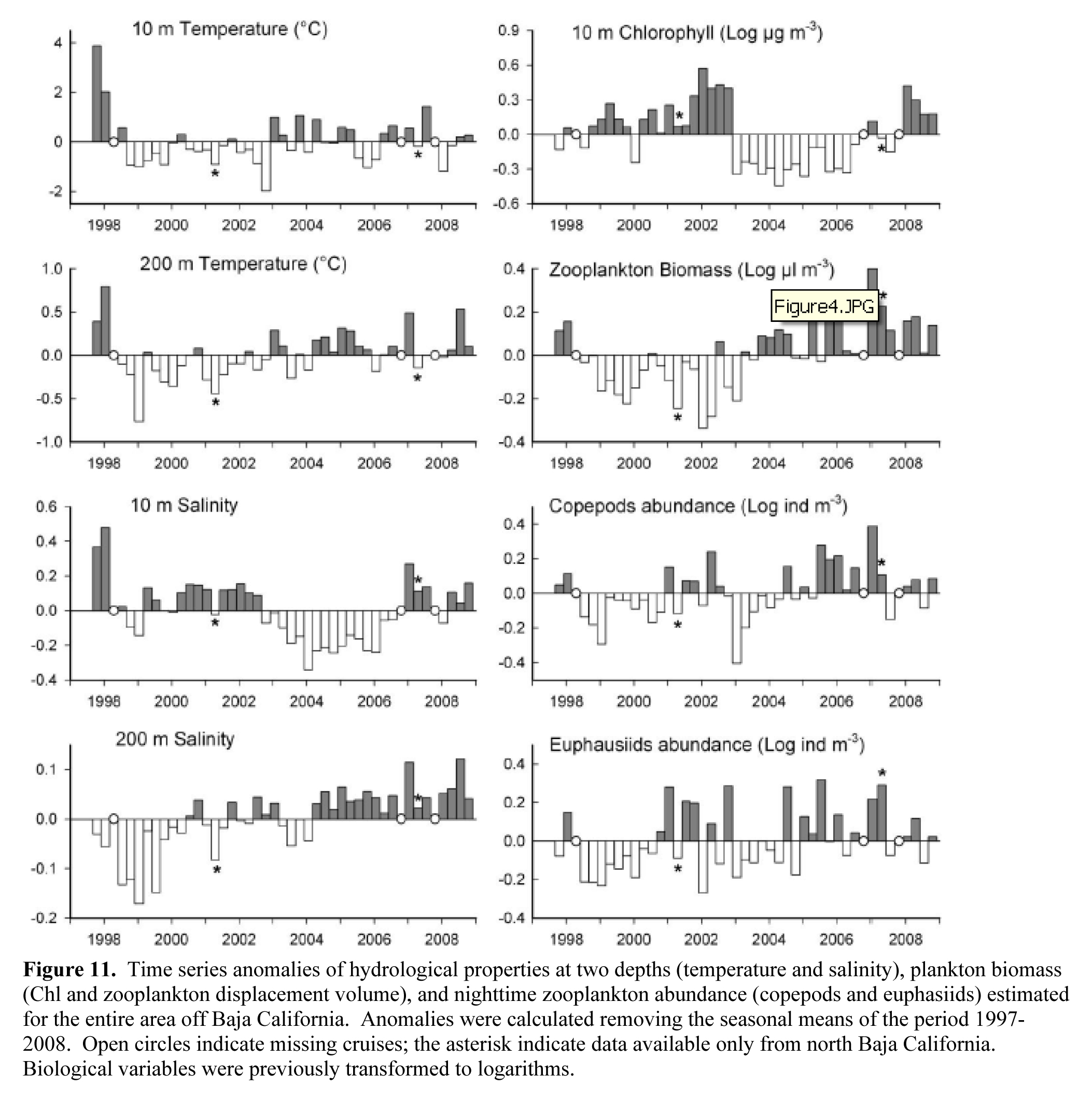 I’m rather at a loss for explaining this. I don’t think it’s due to higher inputs of pollution. I wonder if ocean primary productivity of the California Current is still on the rise. If so, then the greater phytoplankton activity could be enhancing amounts of dimethyl sulfide (DMS), a major precursor to sulfuric acid in the air and rain over the oceans. The figure below, from a NOAA report “Climatic and Ecological Conditions in the California Current LME for July to September 2009“, indicates that, as of last year, the chlorophyll abundance, which is a fair indicator of primary productivity, has been on the rise in recent years.