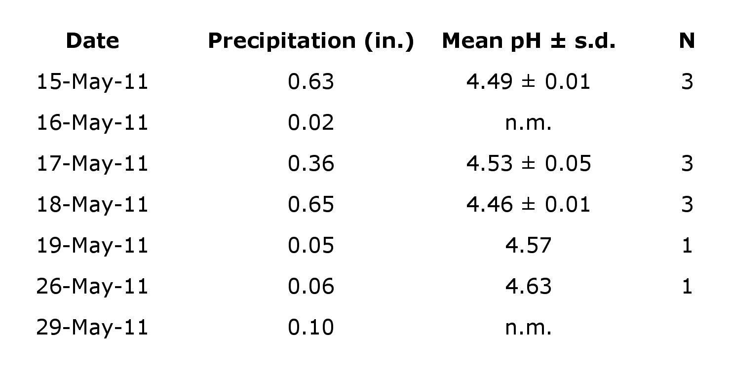The rains in May were notably acidic. There were five measurable rainfall events with pH values ranging between 4.46 to 4.63. The table below shows all the results for May 2011.