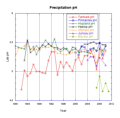 The linear trends of the stations shown above are mixed, with Tanbark, Pinnacles, and Hyslop stations showing an increase pH over time, and Hopland, Olympic, Juneau, and Big Sur stations showing a decrease in pH. The reason for the differences in trends is not clear. The increase in the Tanbark pH may be due to the fact that it is influenced by pollution form the LA basin, and improved air quality may be contributing to the observed increase in pH at that station.