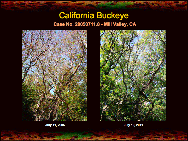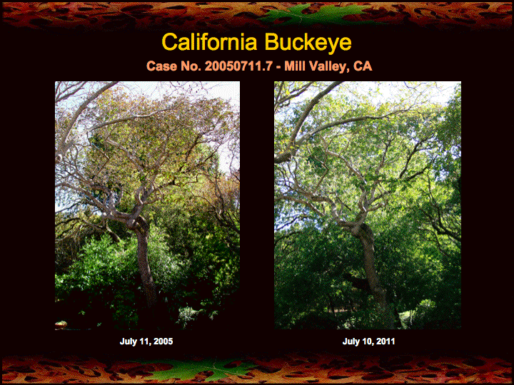 Six years ago these California buckeyes in Mill Valley were suffering from early leaf senescence. The owner wisely followed my fire mimicry protocol in treating the buckeyes, and six years later we see that the buckeyes are no longer experiencing early leaf senescence. As can be seen in results from these same trees posted from year 4 and year 5, these buckeyes have not been experiencing early leaf senescence for the past 3 years.