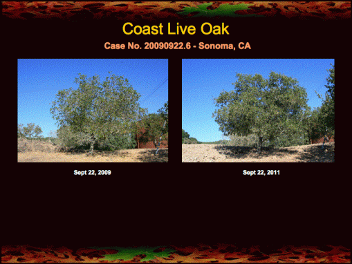 Last week I visited an oak grove in Sonoma where restoration efforts using fire mimicry began in 2009. Several of the coast live oaks had symptoms of Sudden Oak Death, and many other oaks were in rather poor health. Underbrush was cleared, dead branches were pruned, mosses and lichens were removed from the trunks, minerals were applied to the soil along with compost and mulch, and the trunks sprayed with a mineral-rich lime spray.