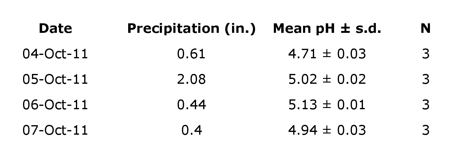 The rainy season has started early again this year in Big Sur, with the first rains falling on October 3. October rainfall at my rain gauge (see station photo below) totaled 3.53”. Below are the pH readings. Three of the four readings are notable higher (less acidic) than usual here in Big Sur, though all the readings are more acidic than what is considered normal for unpolluted rainfall pH (~ 5.6). This is not meant to imply, however, that the acidity measured here in Big Sur is due to anthropogenic pollution. There is a distinct possibility that a portion of the acidity is coming from natural, oceanic sources. Still, no one knows for sure where the acidity in the Big Sur rain is coming from.