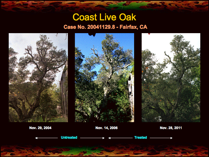 On Monday I visited some oaks in Marin County that have been receiving fire mimicry treatments for seven years. I have been working with my good friends and colleagues Leith Carstarphen of EcoLogic Landscaping and Alan Mart for several years to improve the health of trees and soils on this property in Fairfax. The results have been outstanding. It is interesting to note that at least three of the oaks shown below have had signs of sudden oak death infection since before treatments began, yet they appear to be in remarkable health for being diseased.