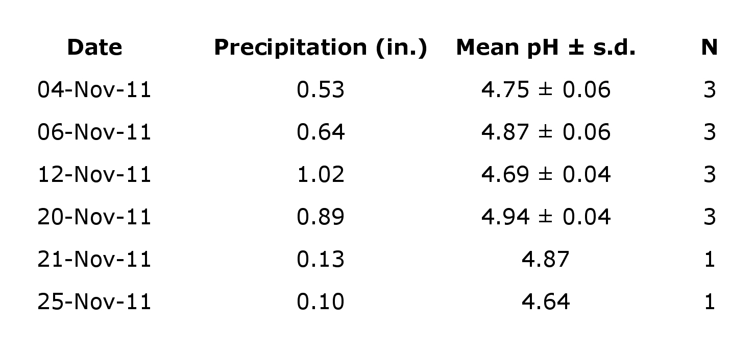 Rainfall amount and pH recorded in Big Sur for November 2011