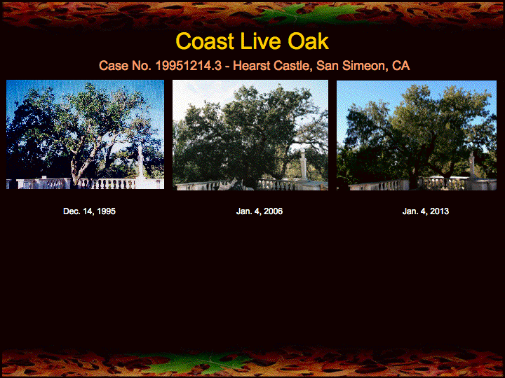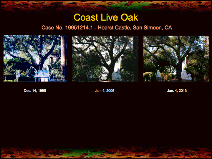 In 2006, when I first started consulting with Hearst Castle about treating their sick oaks using fire mimicry methods, I was provided a set of photos, scanned and printed on a color copier, of several oaks around the castle grounds. I relocated these photos and have re-photographed them every year since 2006.