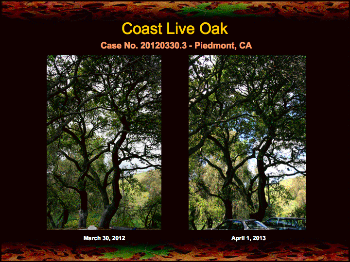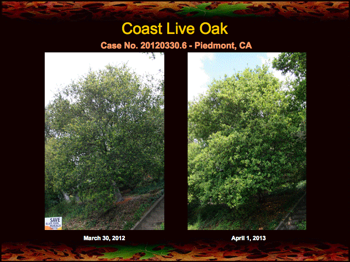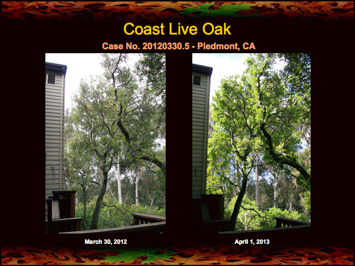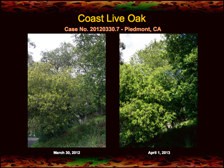 In April of 2012 I was asked by the City of Piedmont to treat several oaks along Moraga Ave. that were appearing unhealthy. Some of the oaks were on a cliff, so I set up a belay and worked spreading minerals and compost tea underneath the oak canopies and applying a lime spray to the trunks. In addition to the City of Piedmont oaks, I also treated several oaks on an adjacent private property at the same time. Here are the results after just one year.