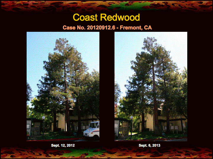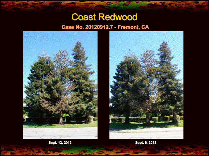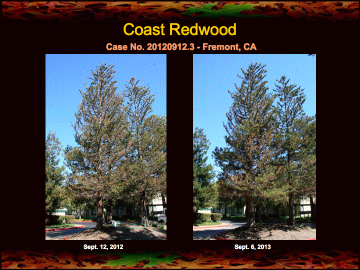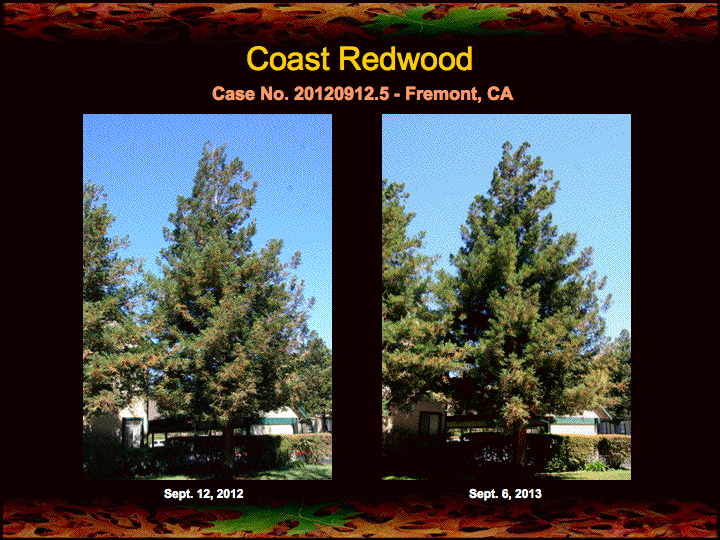 Here are the results after just one year. Most, although not all, of the sick redwood trees are showing noticeable improvement in canopy density. None of the redwoods appear to be exhibiting further decline. Note that in photo set 20120912.2 below, the redwood tree on the left was removed during the past year. It was the one redwood I felt could not be revived with treatments.