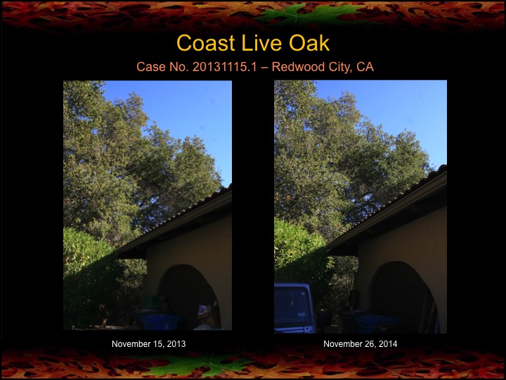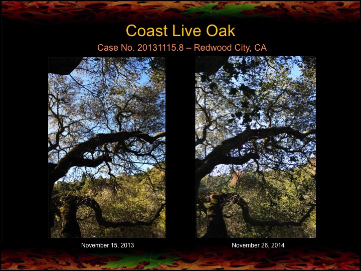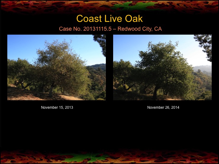 One year later, in November of 2014, we met again as I did my annual inspection his treated oaks. Even before I had time to re-photograph the trees he admitted he had seen significant improvement in several oaks, and was no longer a skeptic of my work.