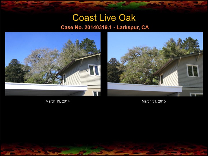 4 04 2015I’ve been away for the past 5 weeks, working on a project in Ireland. (Hint: the project made front page of the New York Times one week ago today.) While I was away I received messages from two clients concerned about the health of their oaks. In both cases they noticed a sudden browning of the oak canopy. The reports were definitely cause for alarm considering the prevalence of Sudden Oak Death, and other diseases and inspect pests that are afflicting the oaks in Marin.