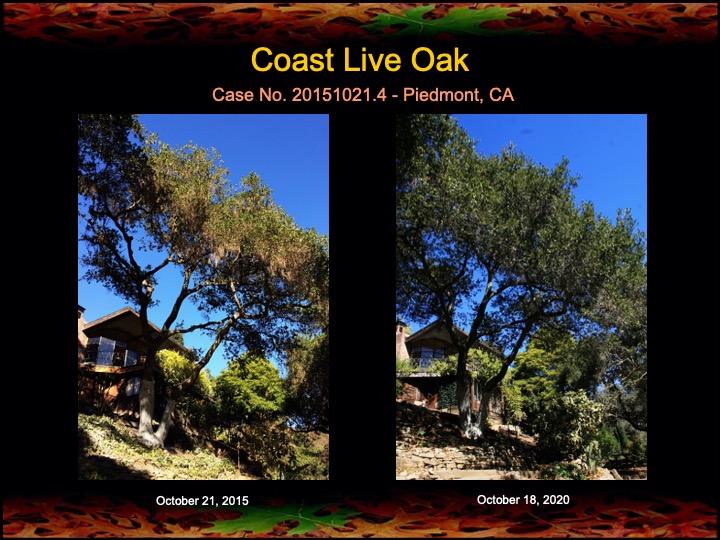 Here are some recent results from a grove of mature coast live oaks in Piedmont, CA treated with fire mimicry for the past 5 years. Most of the oaks are showing lusher, greener canopies, although one oak (shown below) has succumb to Sudden Oak Death. The remaining oaks have no sign of disease.