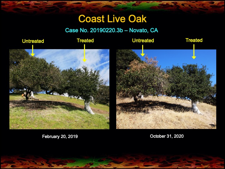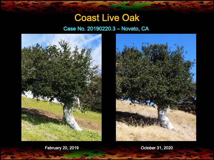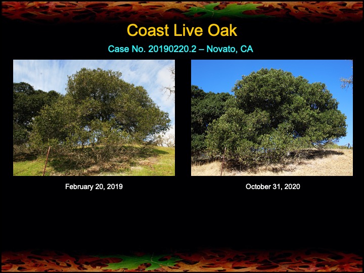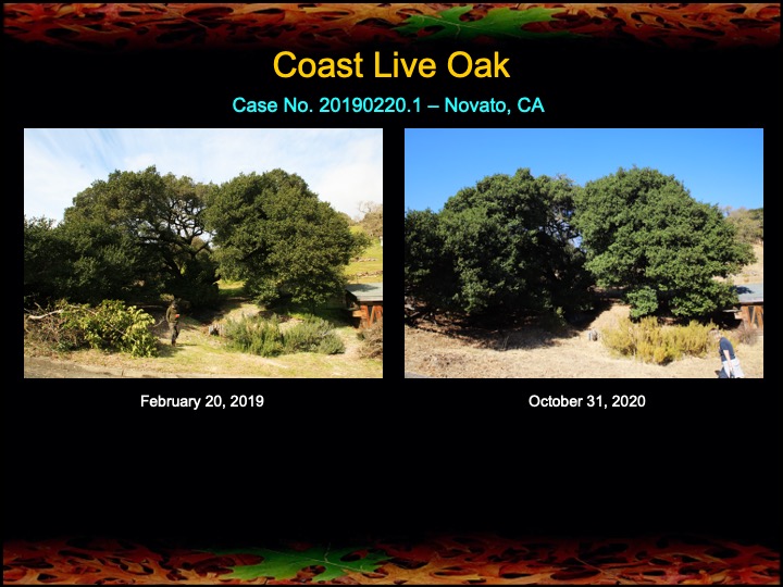 The above coast live oak is a ~500 year old coast live oak that was clearly pollarded by resident Coast Miwok people. I recently inspected this and several other coast live oaks treated with fire mimicry in February of 2019. Due to the difference in time of year of the photos these results are not exact comparisons. Still, significant improvement in canopy density and lushness is apparent in all the oaks, except for the untreated (control) oak shown in the final image.