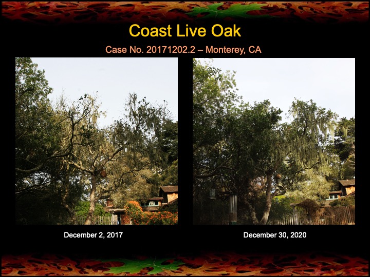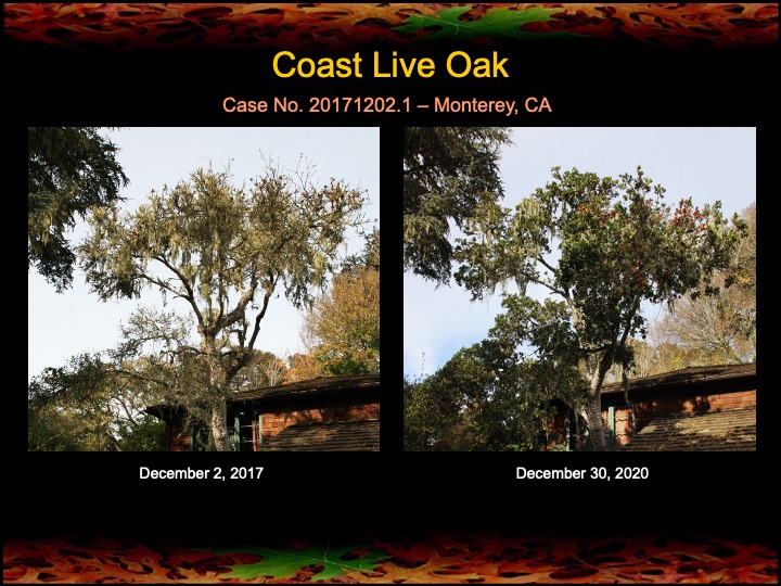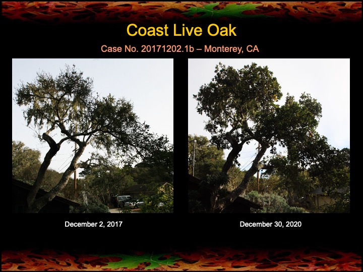 Three years ago I began fire mimicry treatments on a grove of very sick coast live oaks in Monterey, CA. the photos (above and below) indicate that most of the oaks have responded nicely, showing improvement in canopy density and lushness. Note that one severely diseased oak below (Case No. 20171202.6) had a surgery and cauterization procedure that appears to have been successful. At least for these trees, 2020 has ended on a positive note!