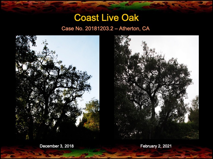 Happy Valentines Day! A little over 2 years ago I began fire mimicry treatments on three sick heritage oaks in Atherton, CA. The third oak in this series has a severe stem canker infection, probably Sudden Oak Death, that was surgically treated. Here are the results showing a noticeable improvement in the density of the oak canopies.