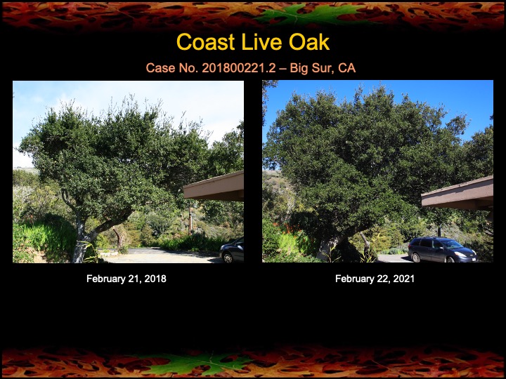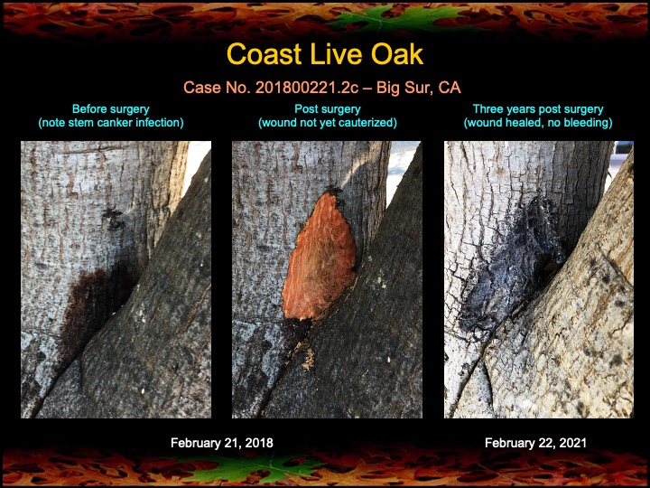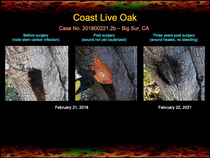 Three years ago I came across a coast live oak in Big Sur with two stem canker infections, probably Sudden Oak Death. The above photo shows one of the infections prior to treatment. In the original post two years ago “Surgical procedure for Sudden Oak Death” I showed the suite of steps involved in removing, cauterizing, and poulticing the stem canker infection. This oak has also received fire mimicry treatments, which involve moss and lichen removal, along with applications of compost tea, soil minerals, and limewash. Below are the results after two years. While the wound it darkened due to the cauterization, it is clear to me that upon careful inspection both wounds are showing rapid healing and no sign of infection remains. The final photo set shows that the canopy of the oak is denser and lusher than prior to treatment.