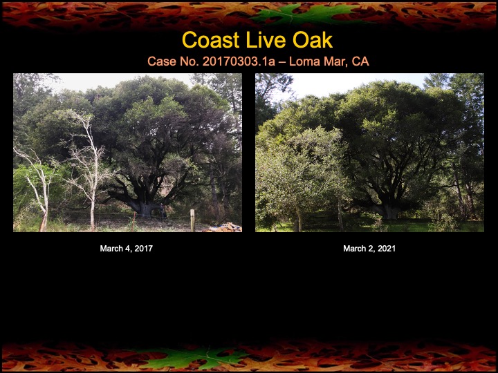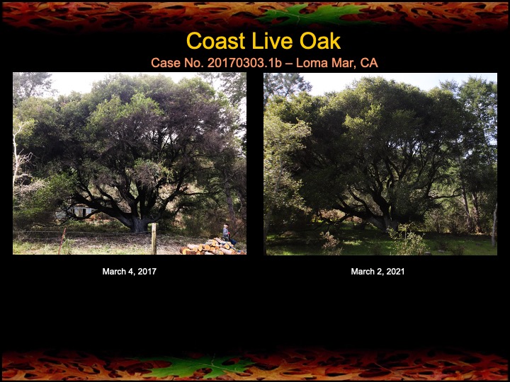 Fours years ago we began fire mimicry treatments on an ancient, Ohlone-era coast live oak near Loma Mar, CA. Affectionately called Grandmother oak by the owners, she measures 17′ 8″ in circumference and is likely more than 500 years old. We started by clearing away the woody understory, removing nearby young firs and bays, and pruning off the dead lower limbs. Then we fertilized with compost tea and alkaline-rich minerals, and applied a limewash to the trunk. We repeated the fertilization treatments for two additional years. Above and below are photos showing how Grandmother oak has responded to care we gave her. She sure seems happier and more vibrant to me!