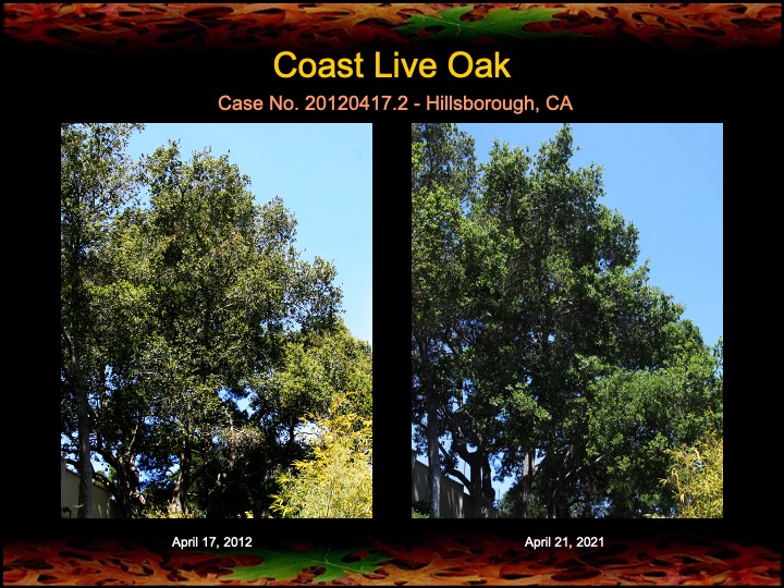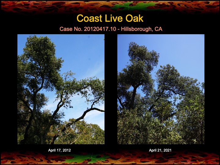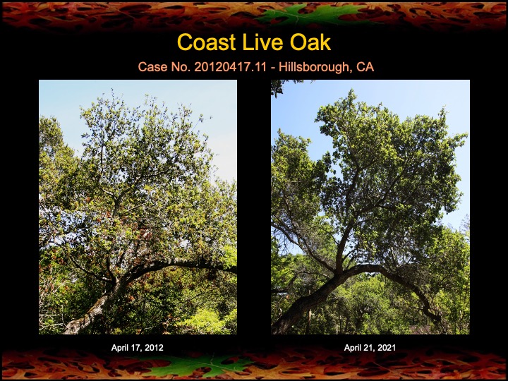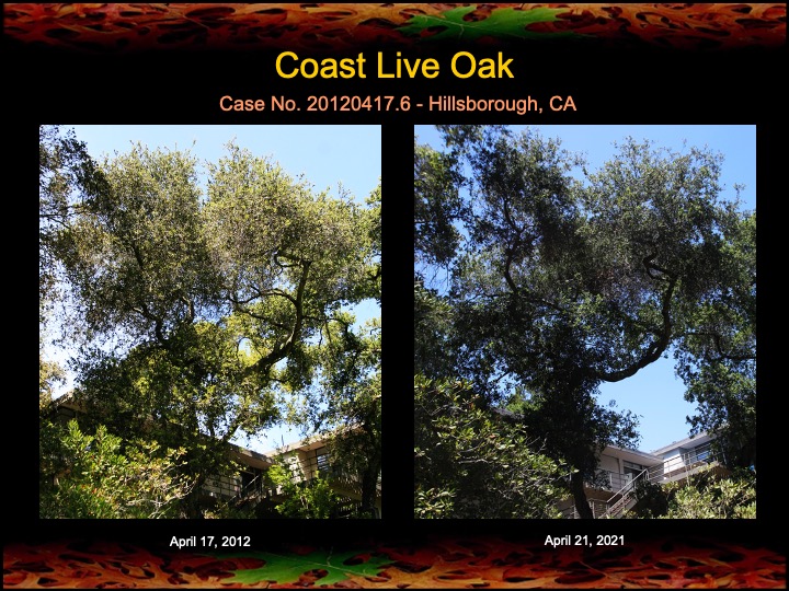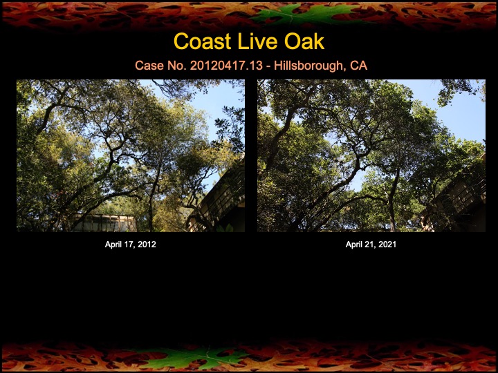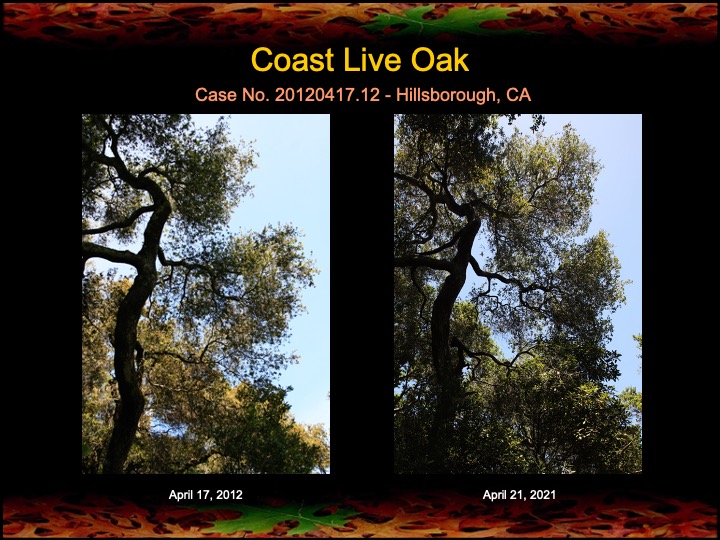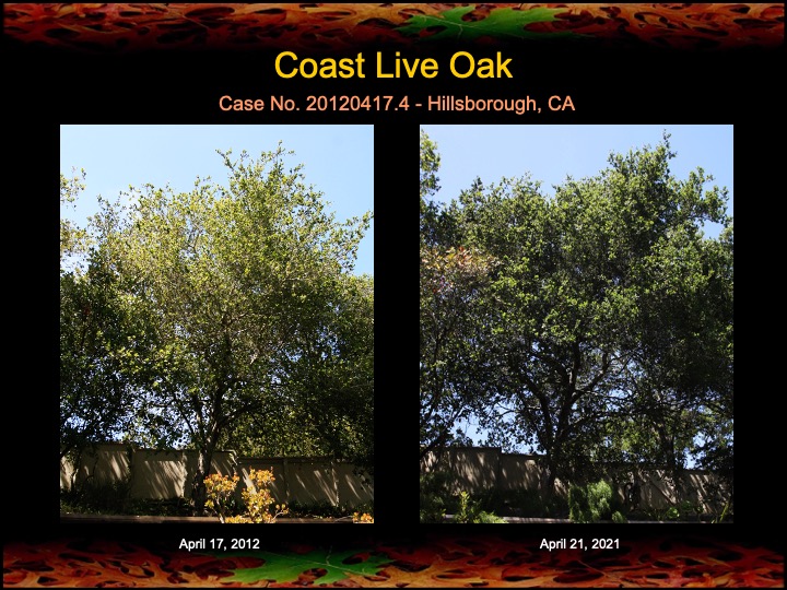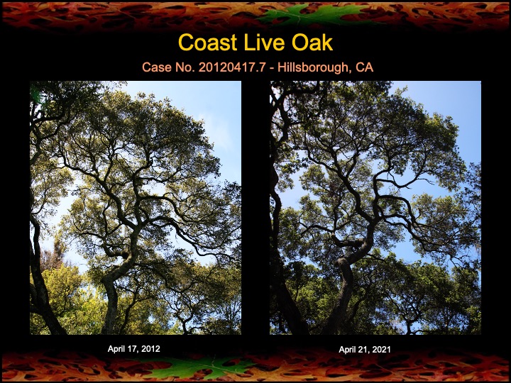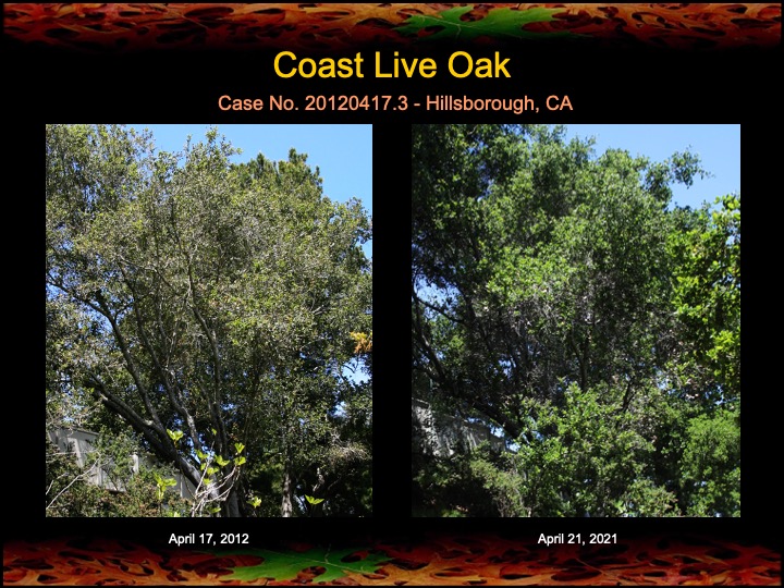Happy Earth Day 2021 from Sudden Oak Life! Here are some coast live oaks that I inspected yesterday, 9 years after starting fire mimicry treatments. Several of the oaks were pruned two years ago, hence the differences in canopy structure. However, the canopy density and lushness has clearly improved in most cases.