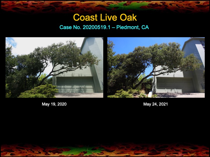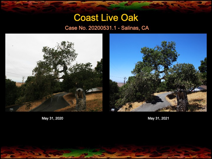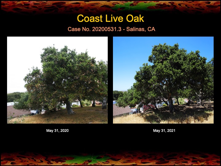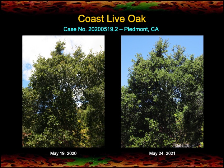 Last year on this date I first treated several ailing coast live oaks with a fire mimicry protocol. To be honest, I was not optimistic about being able to help these oaks, which had been in decline for several years. Still, the owner wanted to try and I’m sure happy that he did. Today I inspected and re-photographed the oaks and, despite the different light conditions, found they have clearly shown improvement in canopy density and lushness. Note that the final oak in this series is UNTREATED.
