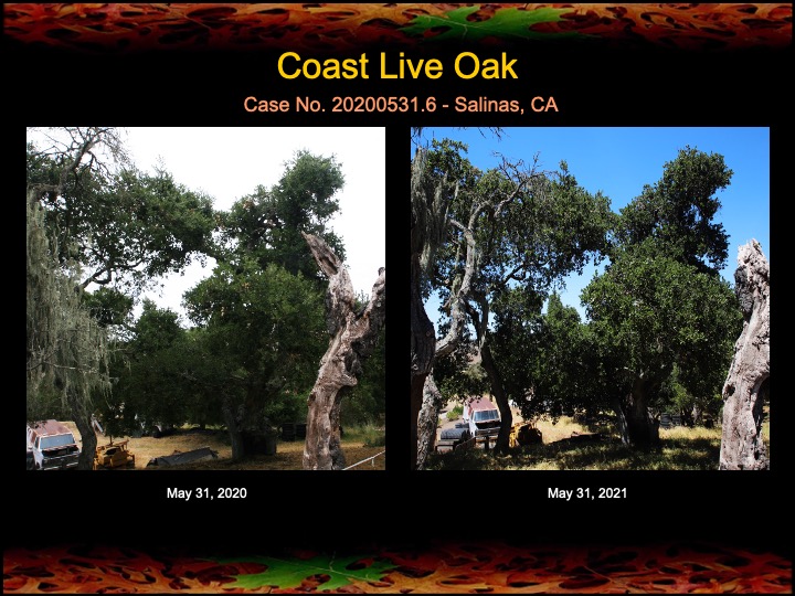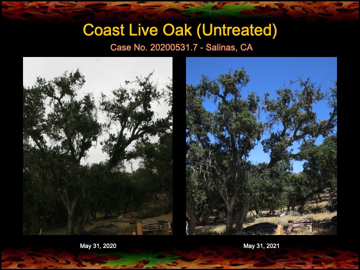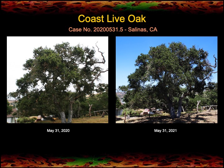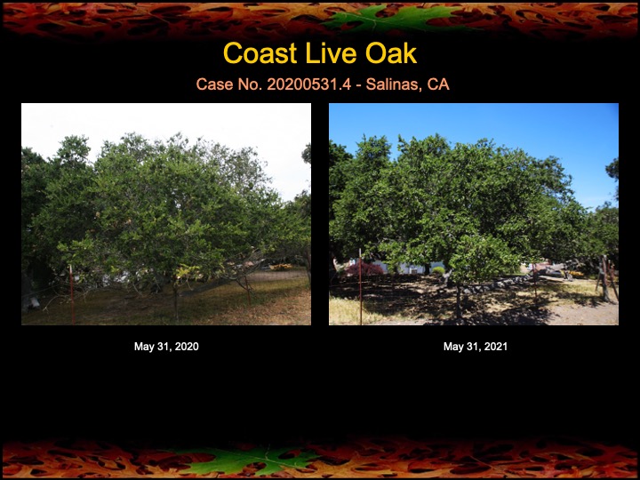 Last year on this date I first treated several ailing coast live oaks with a fire mimicry protocol. To be honest, I was not optimistic about being able to help these oaks, which had been in decline for several years. Still, the owner wanted to try and I’m sure happy that he did. Today I inspected and re-photographed the oaks and, despite the different light conditions, found they have clearly shown improvement in canopy density and lushness. Note that the final oak in this series is UNTREATED.