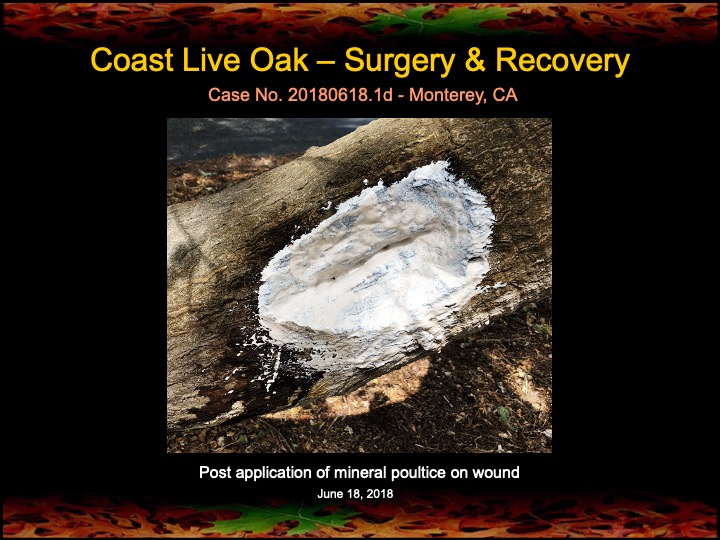 Here is a sick coast live oak with a stem canker infection (probably Sudden Oak Death). At that time a surgical procedure was performed to remove and cauterize the canker (see original post here). After one and a half years this oak has made a significant recovery, both in the healing of the surgical wound and in the lushness of the canopy. Note that there is no further bleeding or other symptoms of stem canker infection. More evidence for the efficacy of fire mimicry.