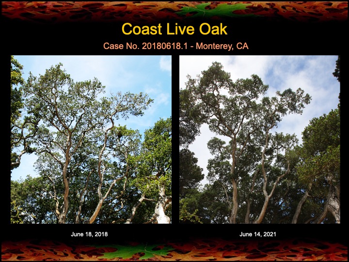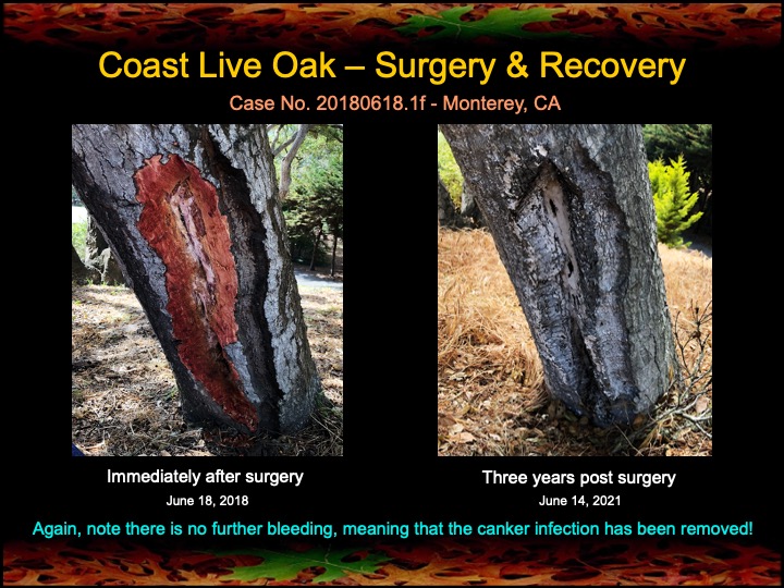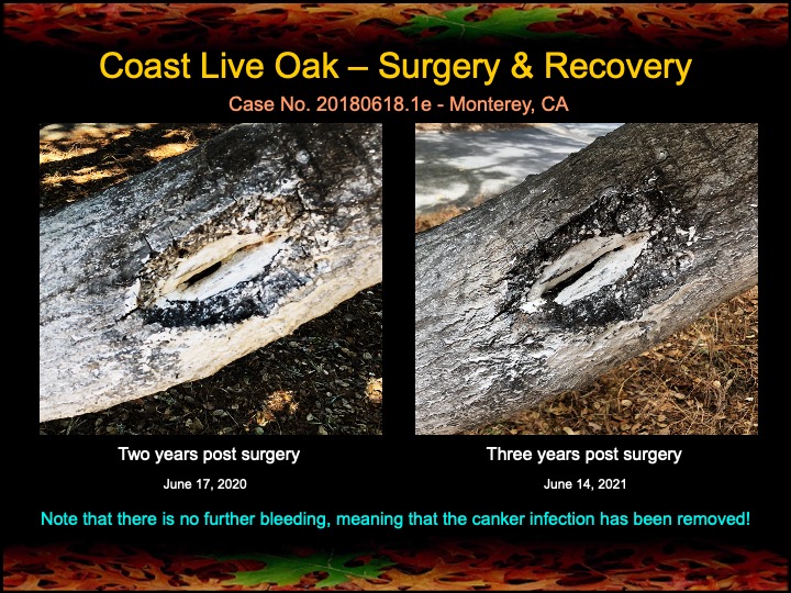 In June of 2018 I discovered two bleeding stem canker infections (possibly Sudden Oak Death) in an old coast live oak in Monterey, CA. I performed fire mimicry treatments on this tree, and surgically removed and cauterized the bleeding stem cankers. Below are photos showing the procedure and as well as the recovery of the wounds and canopy of the oak after three years. Enjoy!