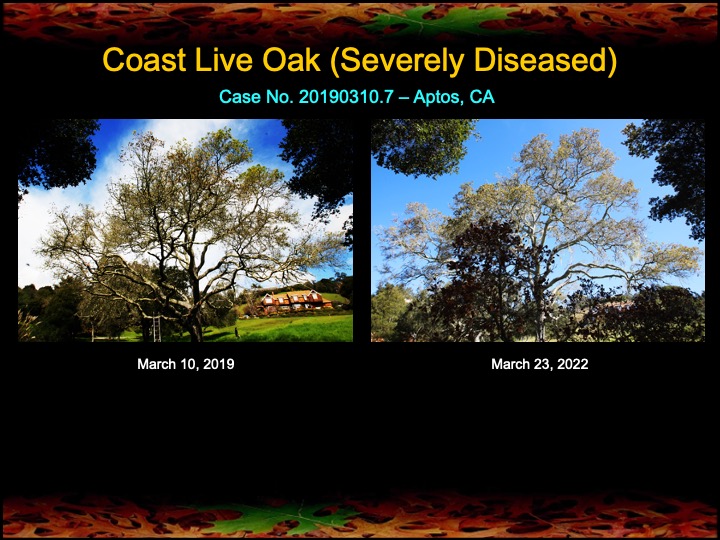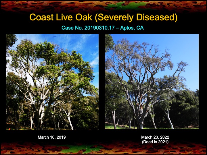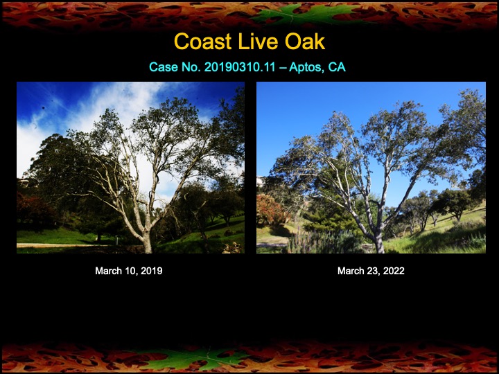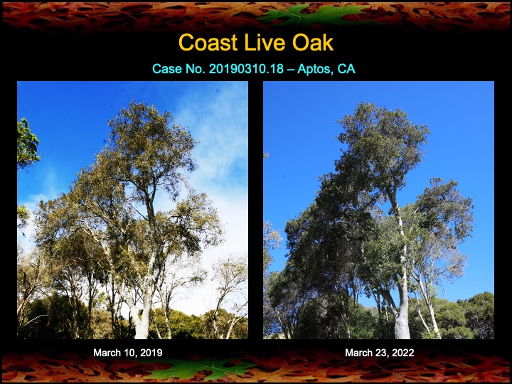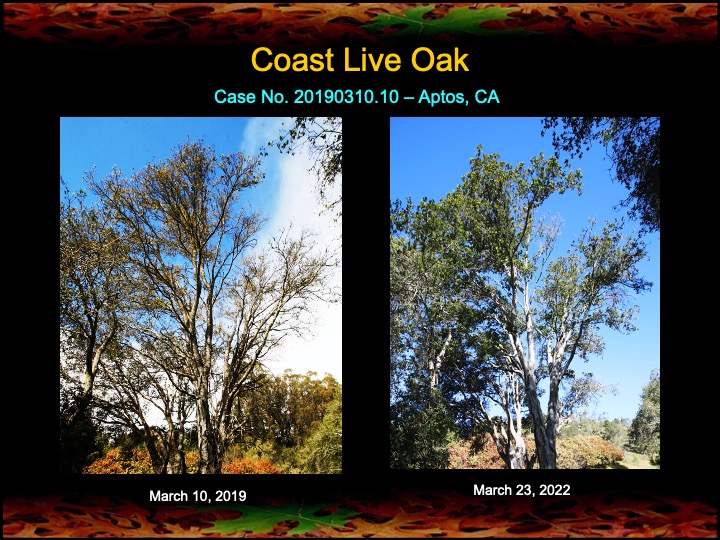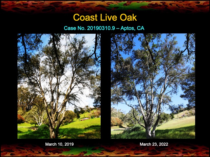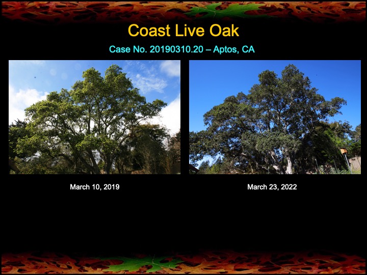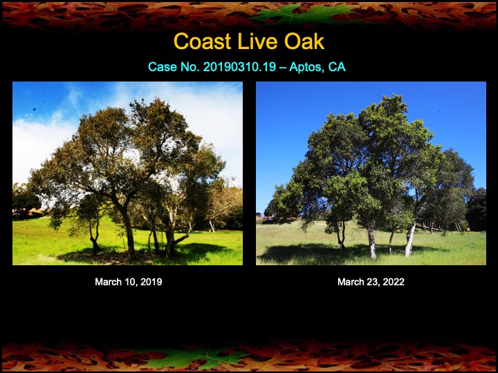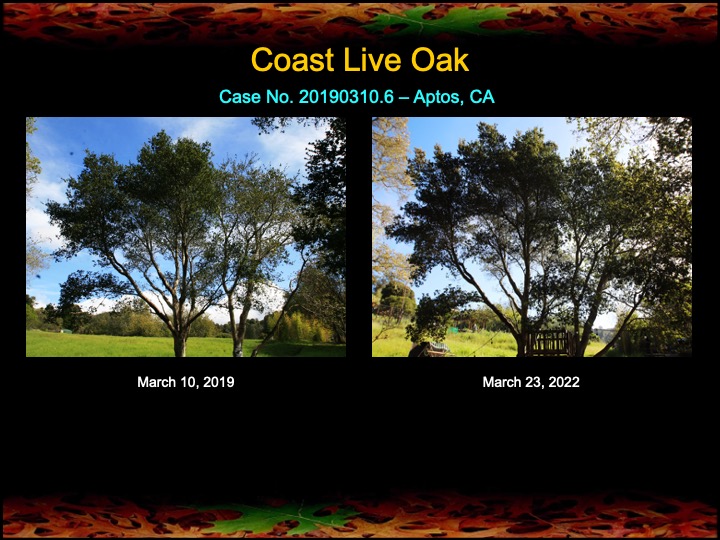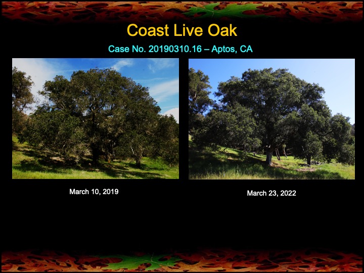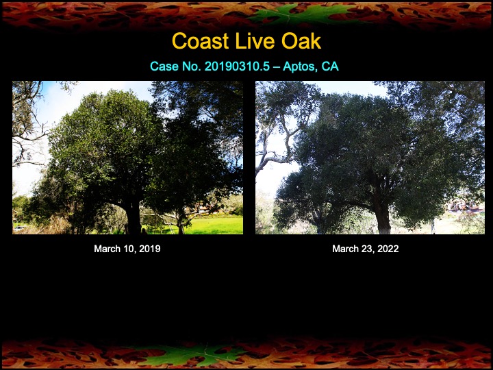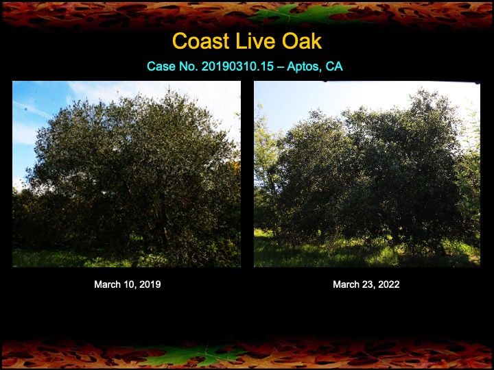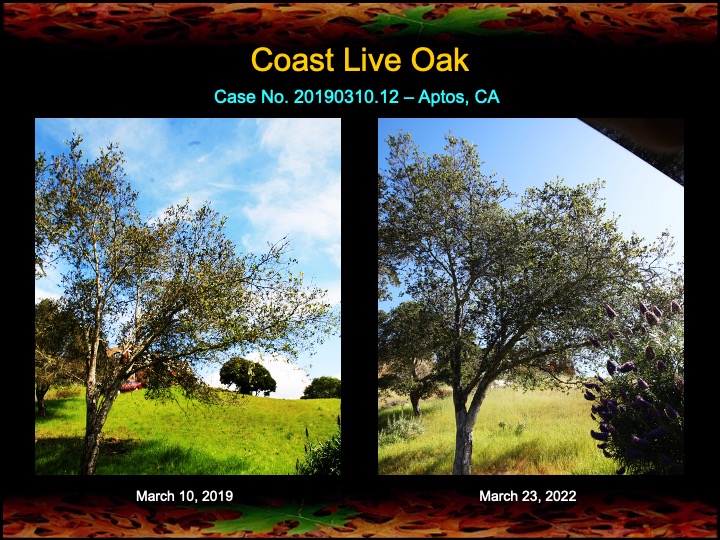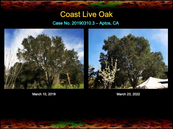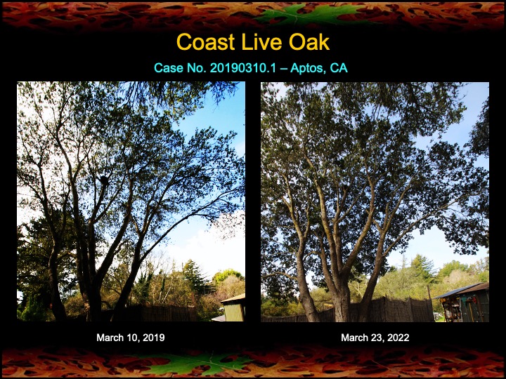 In 2019 I began fire mimicry treatments on a grove of 20 coast live oaks in Soquel, CA, including several “Ancestor” oaks (ancient oaks that were pollarded and otherwise tended by the Ohlone people). Today, I inspected and re-photographed the oaks, with the results shown here. While most of the oaks show noticeable increase in canopy density (leaf area), a few of the oaks have shown little improvement, and one oak died in 2021. Still, I continue to be encouraged by these and other results. Enjoy!