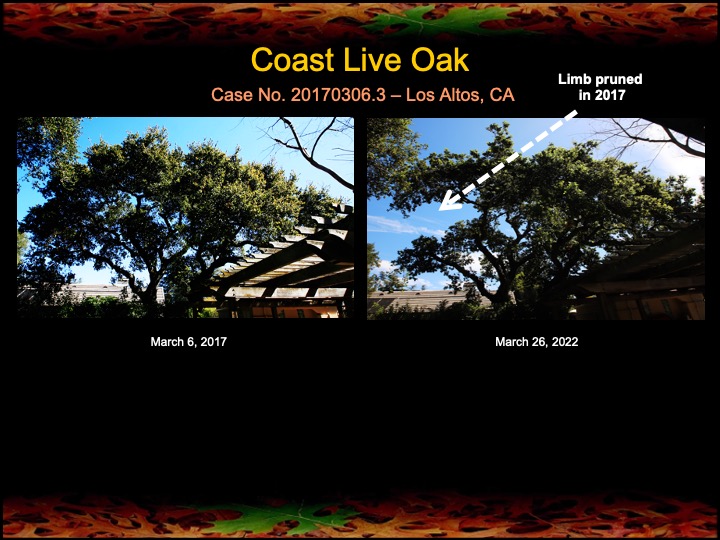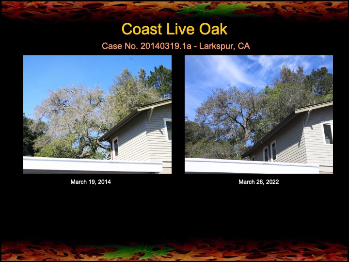 Here are various coast live oaks that have continued to respond to fire mimicry treatments over the course of 5, 8, and 10 years. Several have been affected by stem canker disease, probably Sudden Oak Death, but all have survived and most have improved in canopy density and lushness.
