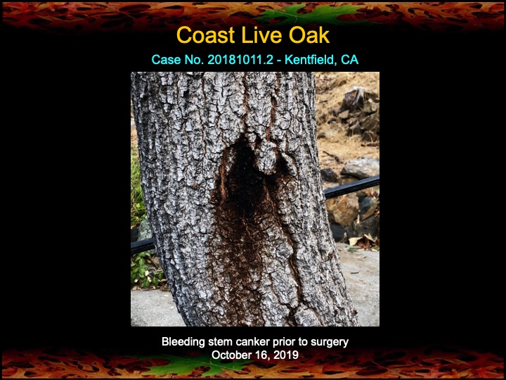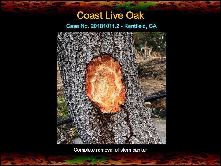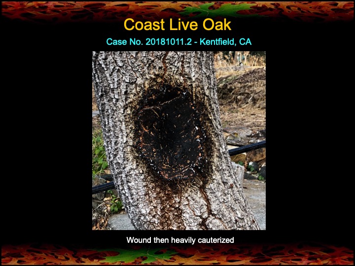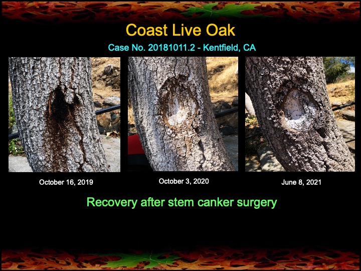 In 2018 I began fire mimicry treatments on a grove of coast live oaks in Kentfield, CA. One of the oaks started showing signs of a stem canker infection (probably Sudden Oak Death disease) in 2019. So I performed a surgical procedure to remove the canker, and have continued to treat this oak with compost tea, mineral-rich soil fertilizers, and limewash. Here are photos of the surgery and recovery of the wound and canopy. Be sure to look at the last picture of this series …