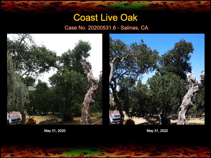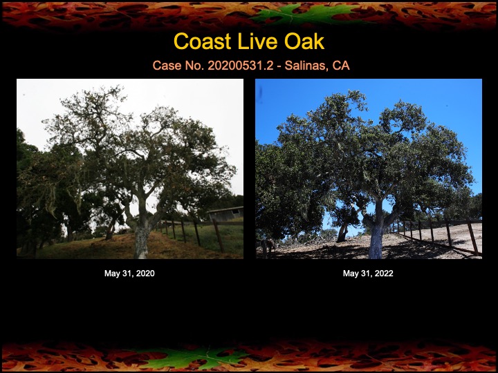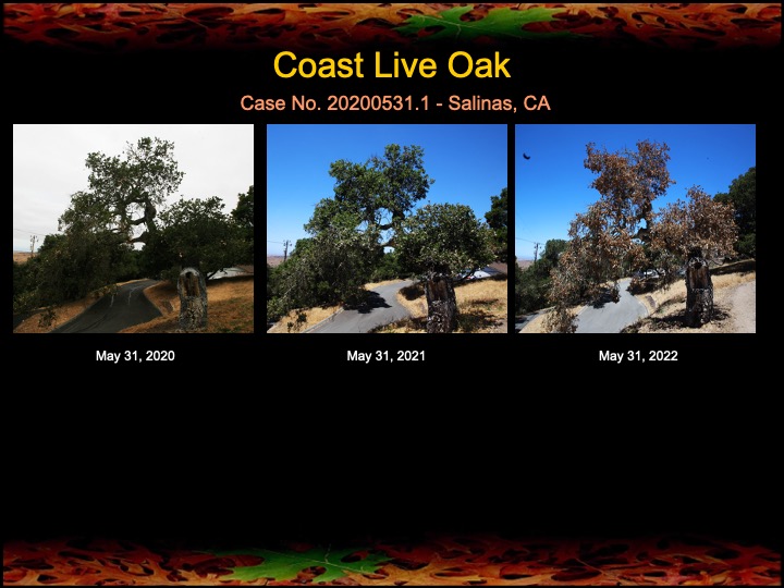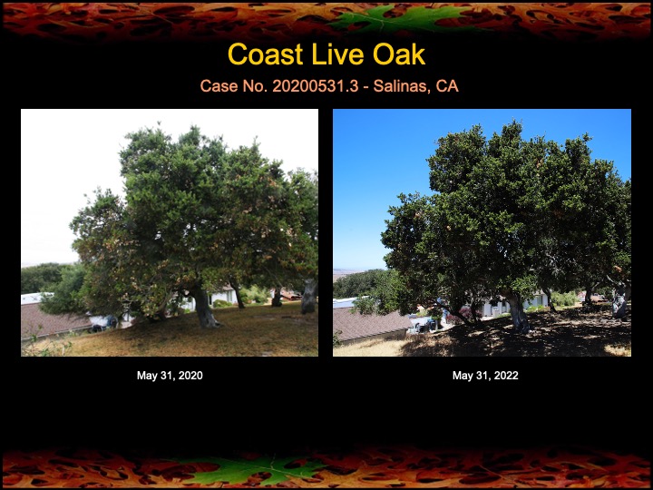Today I inspected a grove of coast live oaks that have received fire mimicry treatments for the past two years. The results generally show improvement in canopy density and lushness, with the exception of one oak (photo below) that made a remarkable recovery last year, but ended up succumbing this year to stress and disease. Note the last photo set of this post showing the canopy of a nearby untreated oak for comparison.
