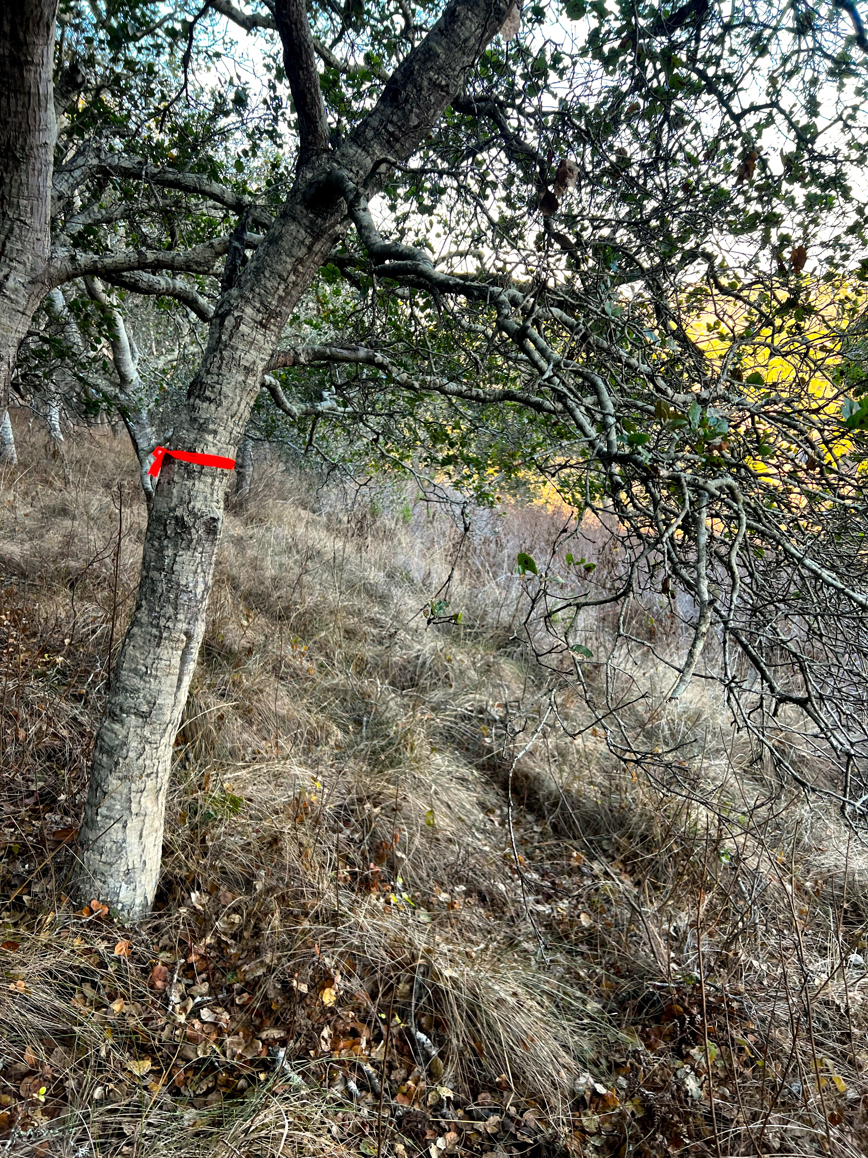 On one particular hillside young coast live oaks have been invading an adjacent prairie of native bunchgrasses dominated by California fescue. Coastal prairie is one of the most endangered ecosystems in California due to fire suppression and conversion to agricultural uses. In places, the oak trees have shaded out and all but replaced the native prairie species. Our work here focused on removing many of the woody shrubs and young oaks along the prairie margin, and thinning and pruning oaks in nearby woodlands that still support substantial bunchgrass cover. Efforts were made to preserved many of the native understory species including toyon, currant, sage, and mountain mahogany. All the removed oaks were less than 6″ in diameter, per county regulations.