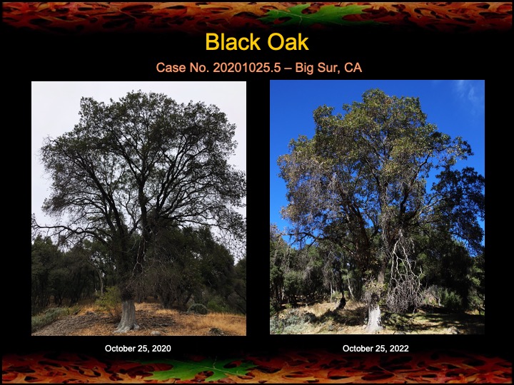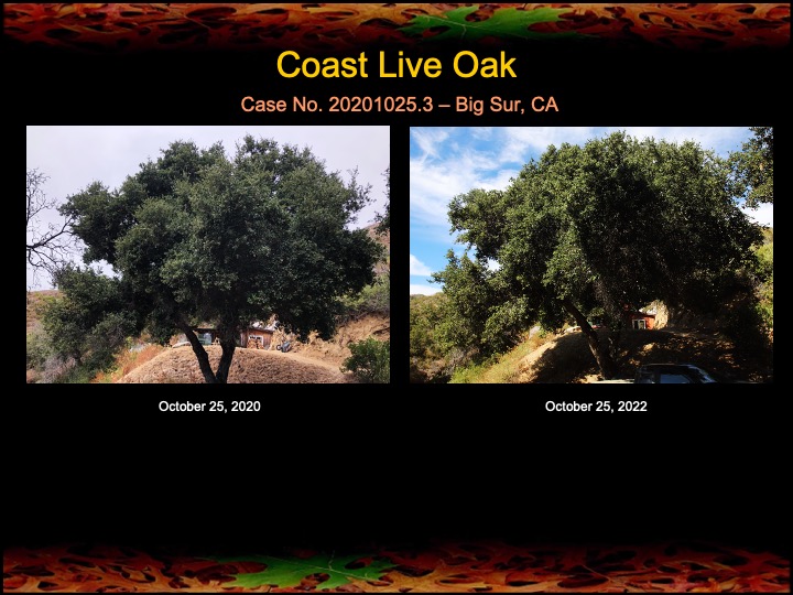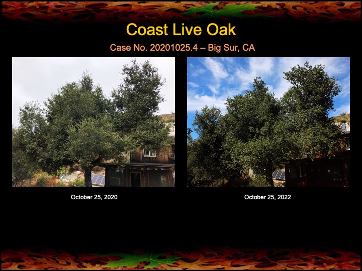 In October of 2020 I began fire mimicry treatments on 4 coast live oaks and one black oak here in Big Sur. The above oak also received a major stem canker surgery. Yesterday I checked on the progress of the oaks at the two year mark, nearly to the minute. I’ll never tire of seeing trees get healthier!