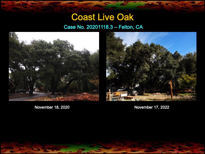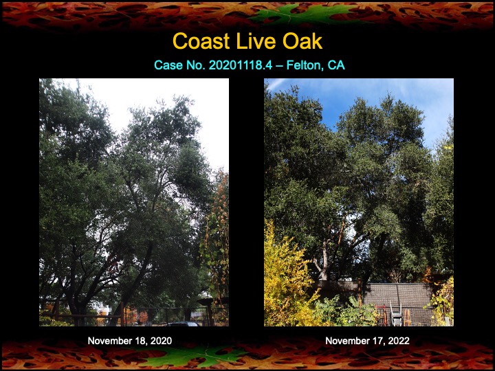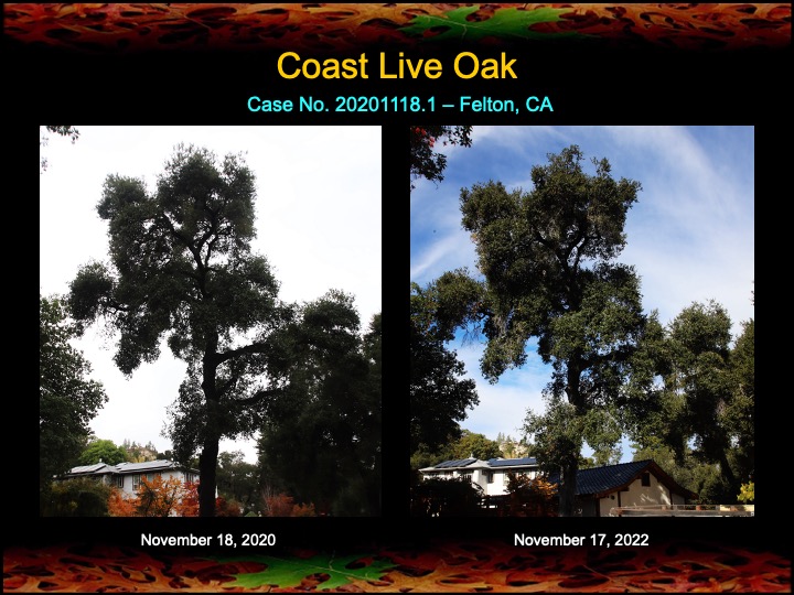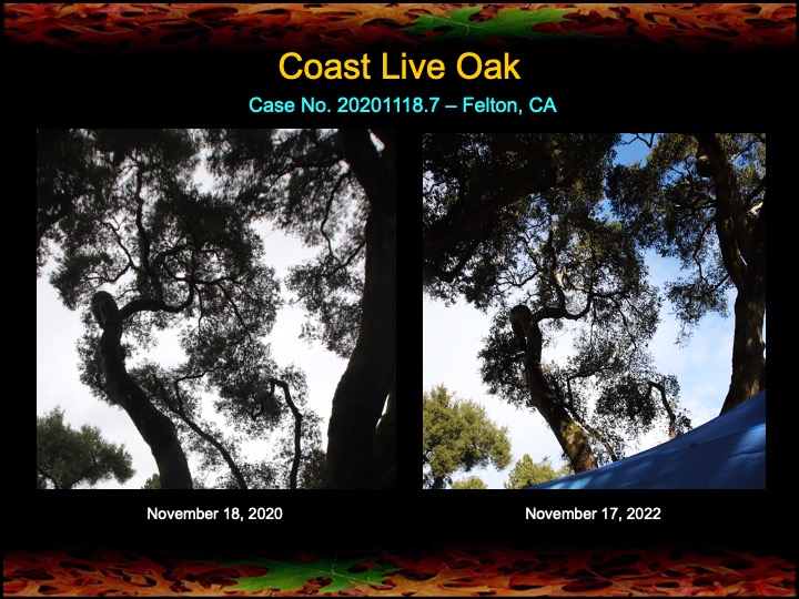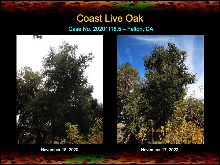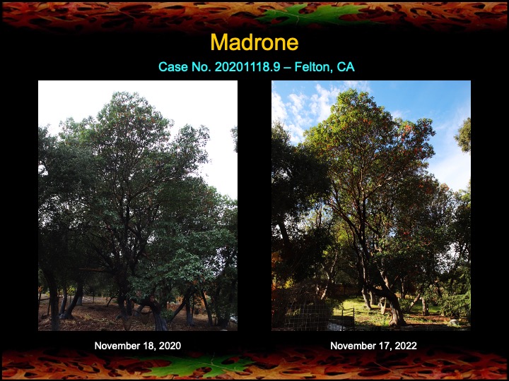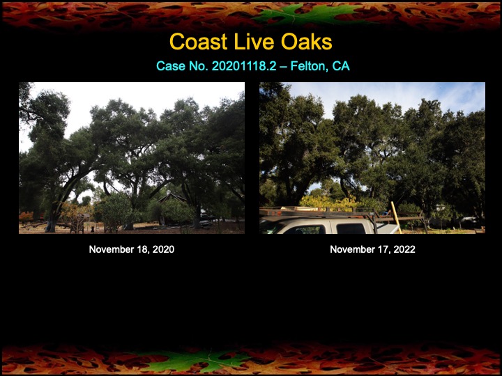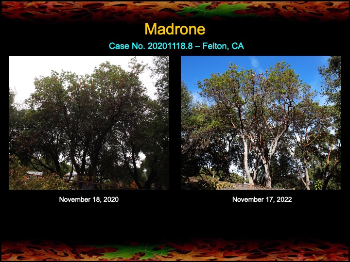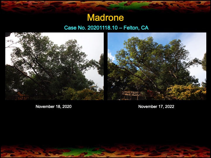 In November 2020 I began fire mimicry treatments on several coast live oaks and Pacific madrones in Felton, CA. Last year, when I checked on these trees, they were already showing a nice improvement (see here). Now after two years nearly all of the trees are showing noticeable positive responses to the treatments, even at the height of drought conditions. Several of the oaks have undergone major stem canker surgeries, but still seem to be on the mend. Hope you enjoy these results as much as these trees.