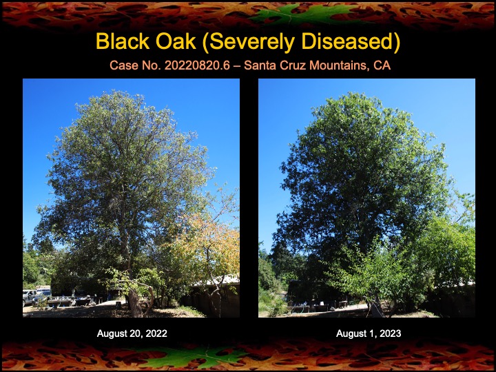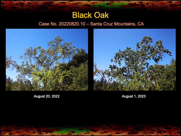 While most of my results are with coast live oaks, I also work with other kinds of oaks. Here are a set of results among black oaks I’ve obtained this past year using fire mimicry methods. Several of these black oaks were severely diseased with Sudden Oak Death infections. The oaks were given compost tea, soil mineral, and limewash treatments, as well as the surgical removal and cauterization of a Sudden Oak Death infection. The surgeries appear to have worked well, as the canopies have improved in lushness and density and there are no lingering infections in the remaining trunk tissues.
