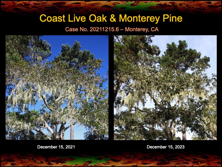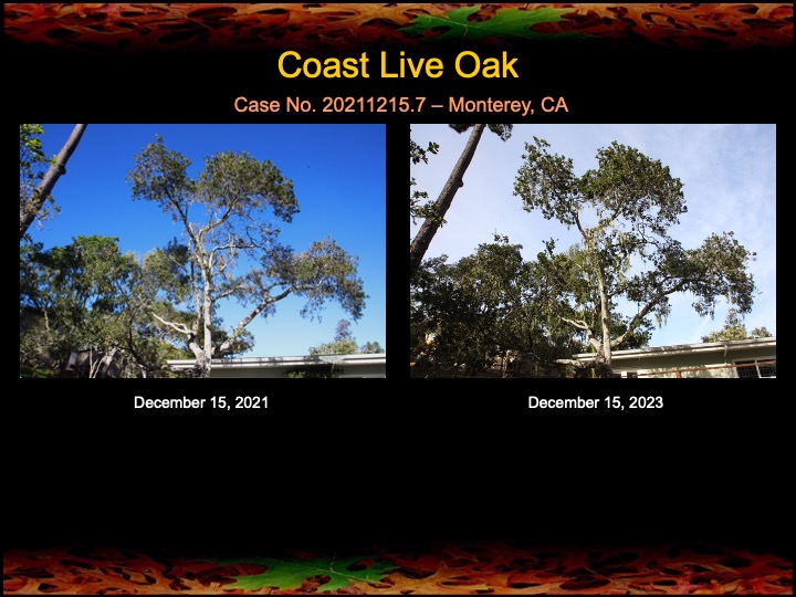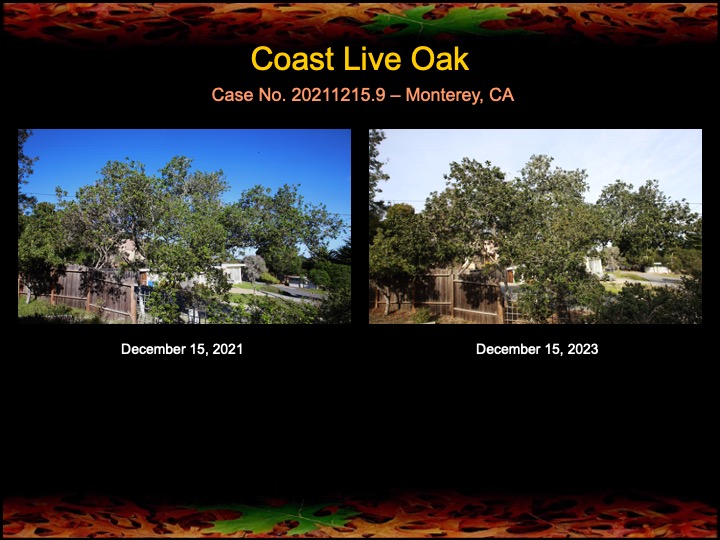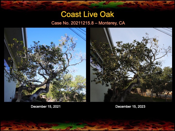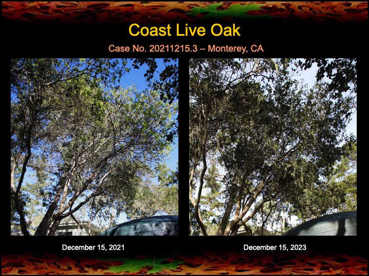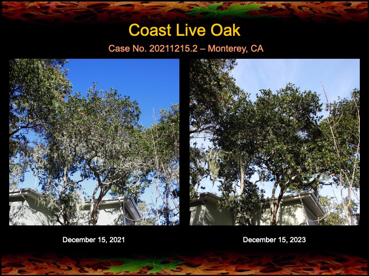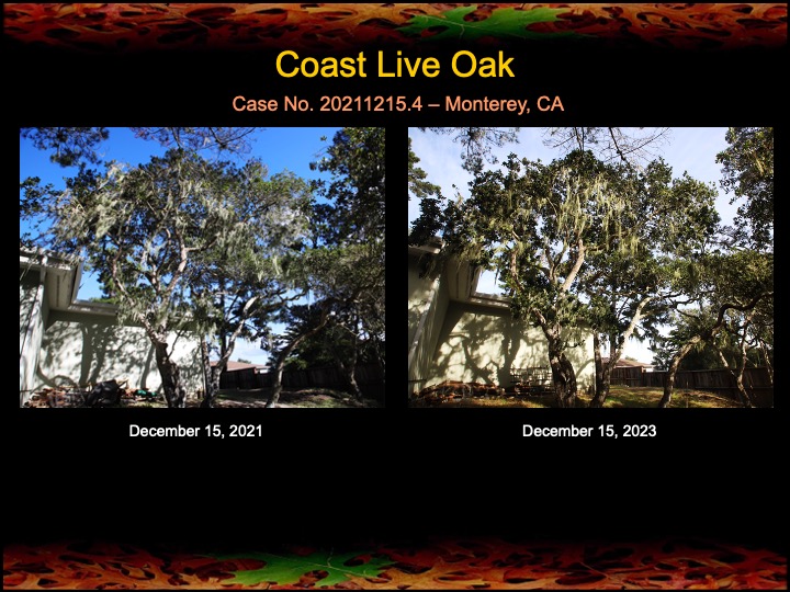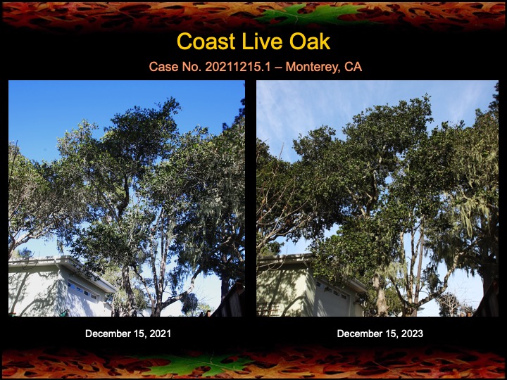 Two years ago I began fire mimicry treatments on several sick and declining coast live oaks and Monterey pines in Monterey, CA. Yesterday I checked on their progress and am generally pleased by the results, as is the homeowner!