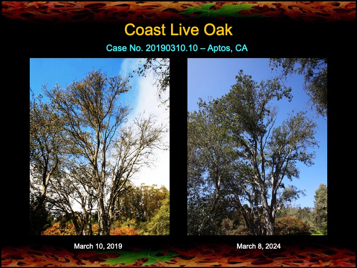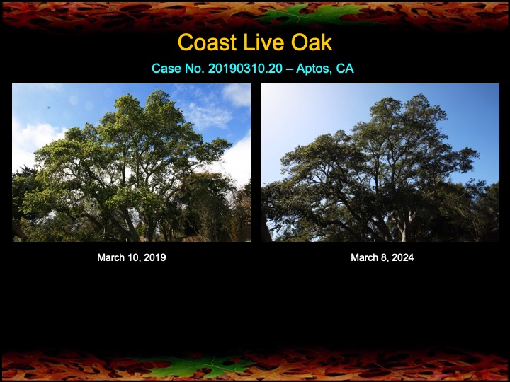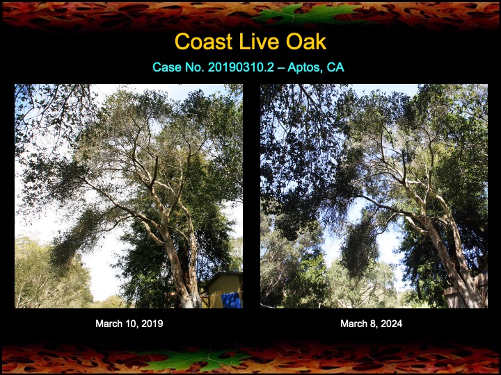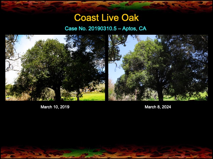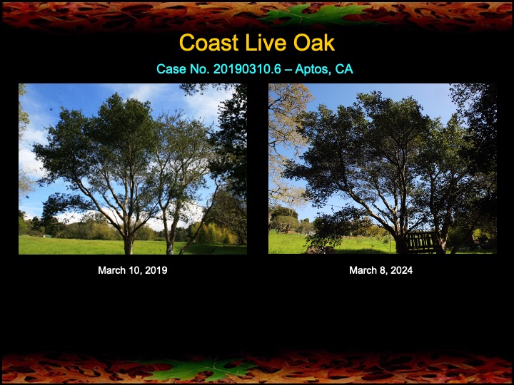Five years ago I began fire mimicry treatments on several coast live oaks in Aptos, CA. Last week I checked on them and here are the results. Most of the oaks have responded well, although a few are not showing improvement. I’m planning to add more biochar in the next round of treatments.