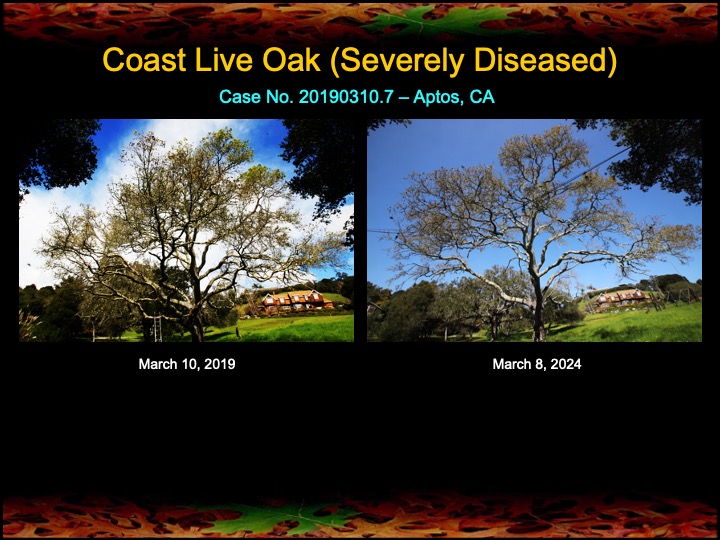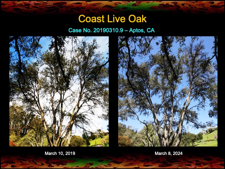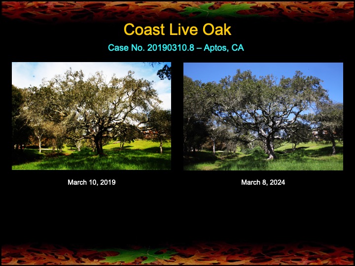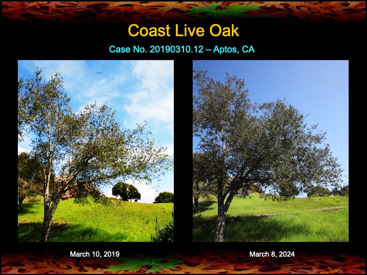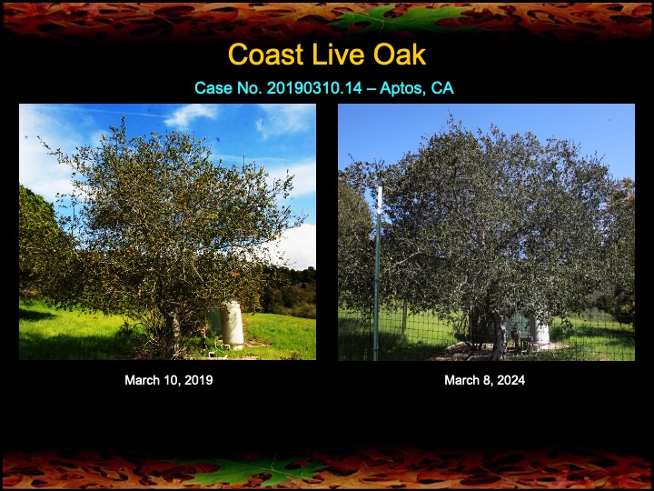 Five years ago I began fire mimicry treatments on several coast live oaks in Aptos, CA. Last week I checked on them and here are the results. Most of the oaks have responded well, although a few are not showing improvement. I’m planning to add more biochar in the next round of treatments.