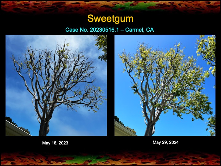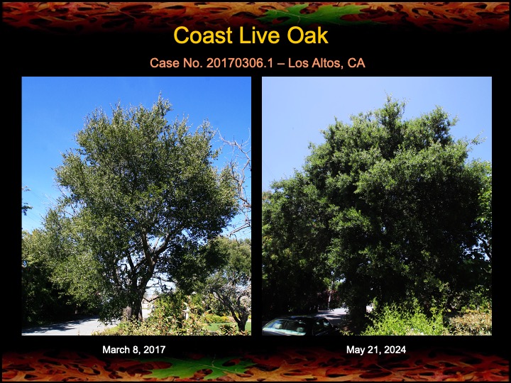 In 2020 a good friend contacted me about care for his sick oaks. I immediately responded and applied fire mimicry treatments on several of his oaks, including a control oak that I did not treat (see below). Here are the results after four years. Note below that one of the diseased oaks initially began to recover nicely in 2021, but ended up dying in 2022. The oak shown above had a stem canker infection (probably Sudden Oak Death) that was surgically removed in 2020, and now shows no sign of lingering infection.