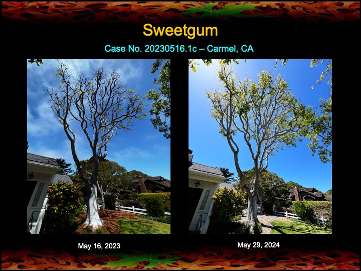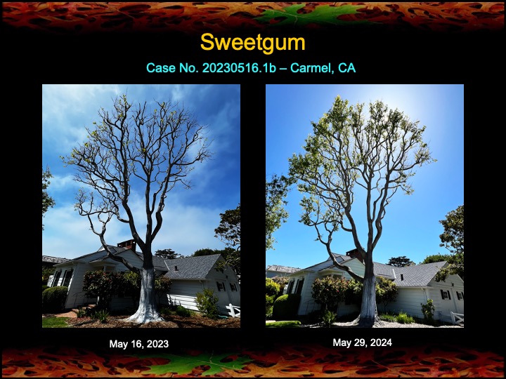 In 2020 a good friend contacted me about care for his sick oaks. I immediately responded and applied fire mimicry treatments on several of his oaks, including a control oak that I did not treat (see below). Here are the results after four years. Note below that one of the diseased oaks initially began to recover nicely in 2021, but ended up dying in 2022. The oak shown above had a stem canker infection (probably Sudden Oak Death) that was surgically removed in 2020, and now shows no sign of lingering infection.