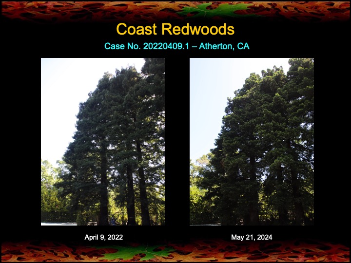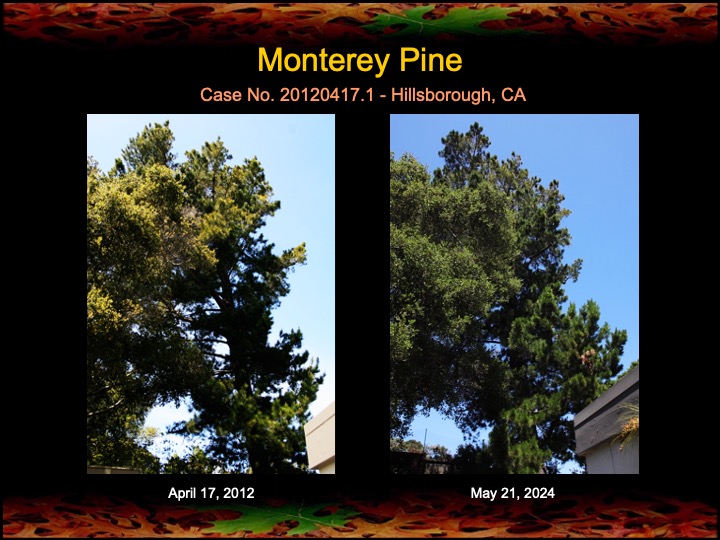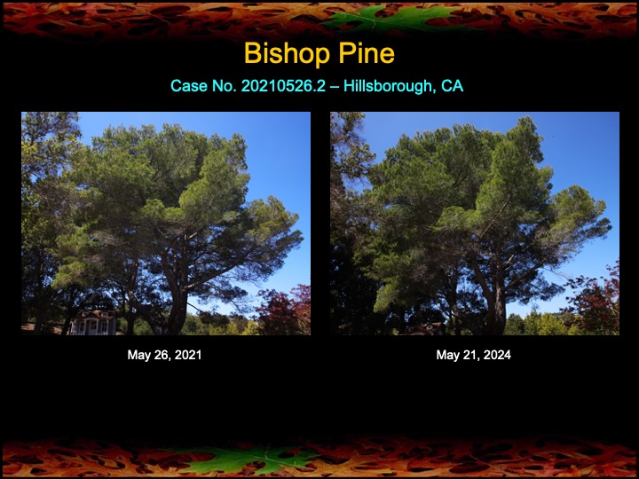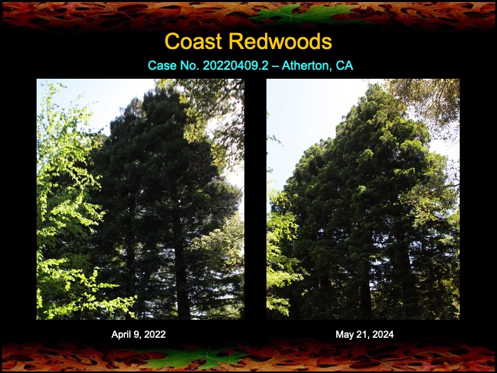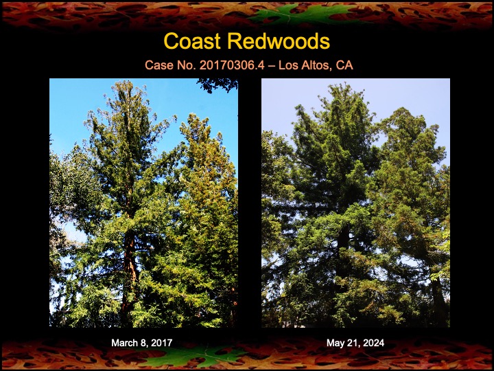 While the focus of my work is on oak trees, I have several recent examples of fire mimicry treatments improving the health of redwoods and pines. The first five photo sets are of coast redwoods after two years and seven years of treatments. Below the redwoods are photo sets of a Monterey pine after 12 years of treatments (every other year), and a bishop pine after three years of treatments. I’m pretty pleased with these results!