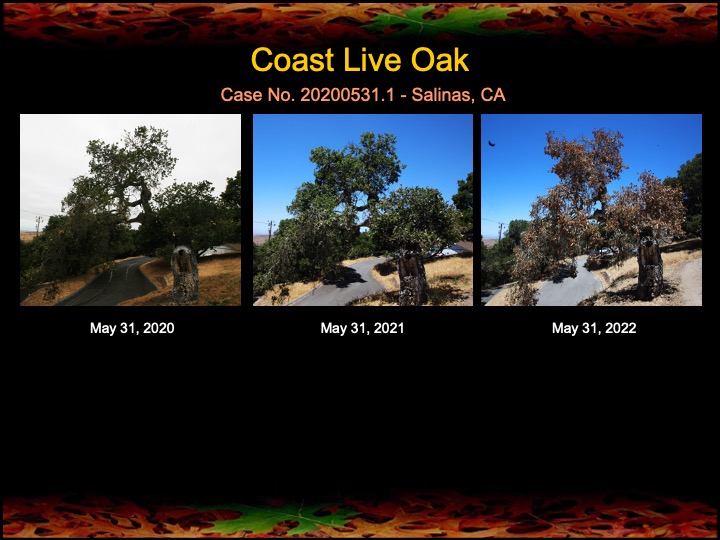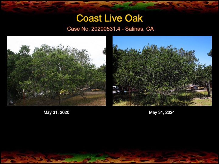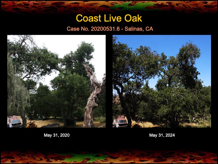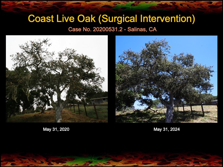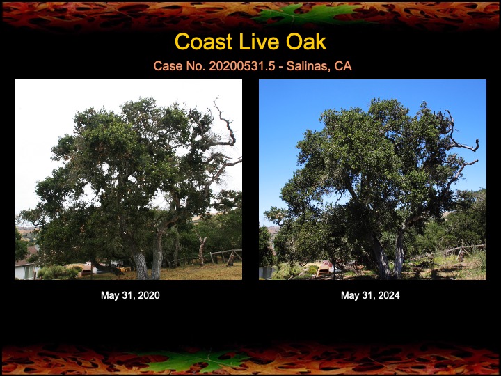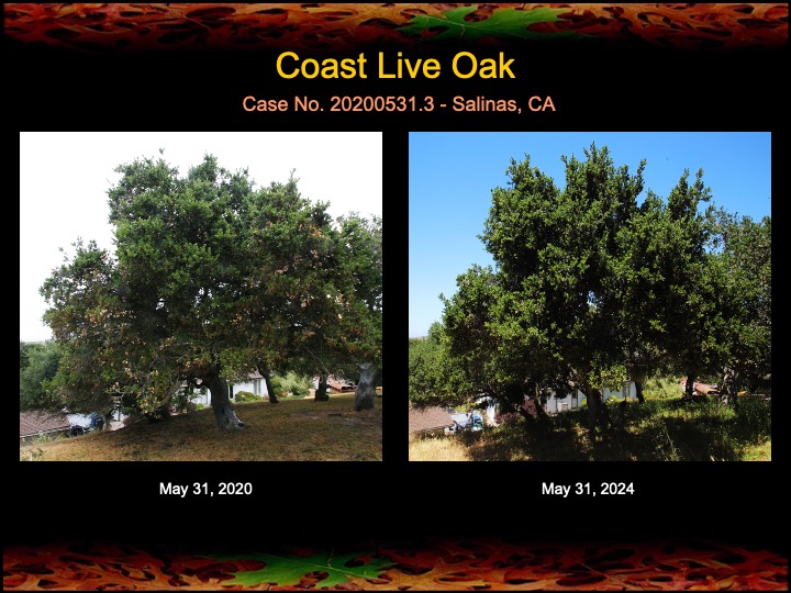 In 2020 a good friend contacted me about care for his sick oaks. I immediately responded and applied fire mimicry treatments on several of his oaks, including a control oak that I did not treat (see below). Here are the results after four years. Note below that one of the diseased oaks initially began to recover nicely in 2021, but ended up dying in 2022. The oak shown above had a stem canker infection (probably Sudden Oak Death) that was surgically removed in 2020, and now shows no sign of lingering infection.