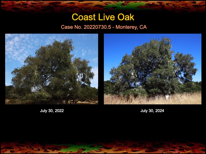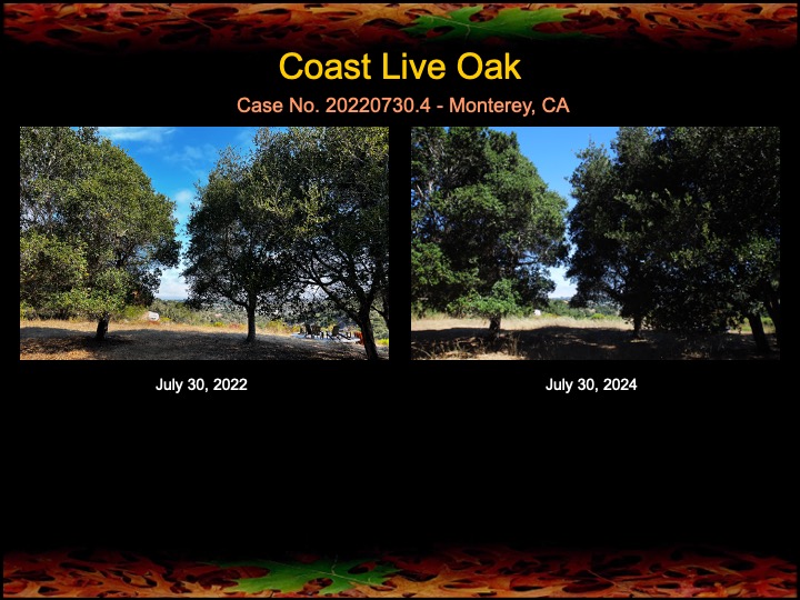 In lieu of fire, I have been applying fire mimicry treatments to several of the ancestor oaks over the past couple years and am seeing a significant improvement in the density and lushness of the canopies of these trees. The above and below photos show the treated oaks today, compared to their appearance two years ago. Enjoy!