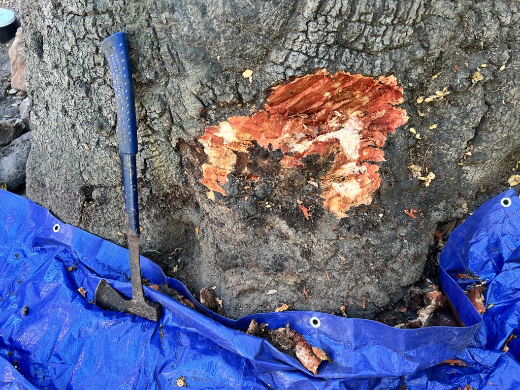 Donning gloves, hat, and eye protection I began the surgery using a large chopping axe with a two-foot handle. For surgeries I prefer to use chopping axes, which have narrower heads than splitting axes. My initial efforts are to find the limits of the infection so as to isolate it from the rest of the tree. In the above photo the dark-colored diseased tissue is clearly visible in the center of the image. The reddish tissue is healthy bark, and the white tissue is healthy wood. I sometimes say “the redder the better” and “wood is good”.
