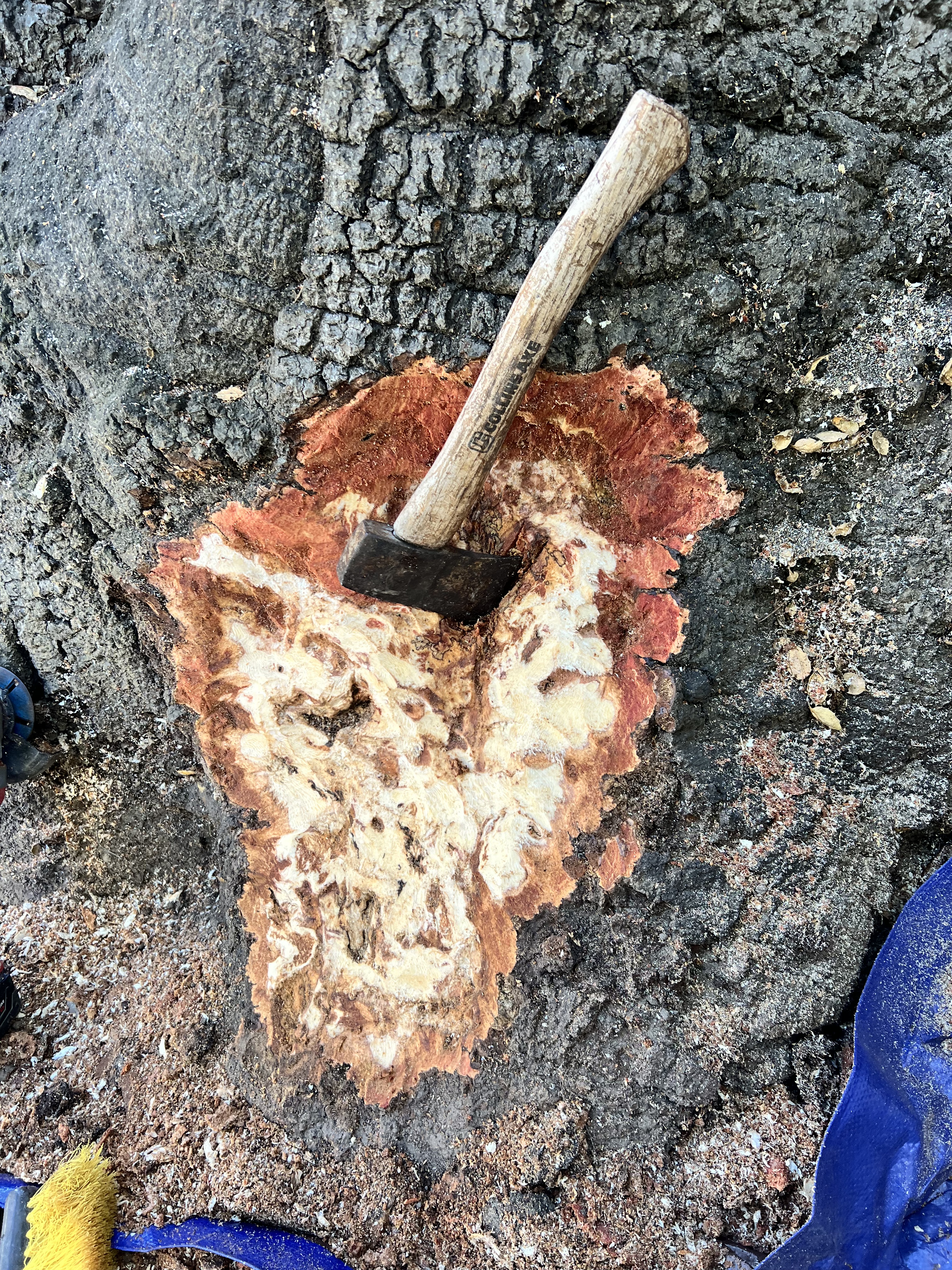 Donning gloves, hat, and eye protection I began the surgery using a large chopping axe with a two-foot handle. For surgeries I prefer to use chopping axes, which have narrower heads than splitting axes. My initial efforts are to find the limits of the infection so as to isolate it from the rest of the tree. In the above photo the dark-colored diseased tissue is clearly visible in the center of the image. The reddish tissue is healthy bark, and the white tissue is healthy wood. I sometimes say “the redder the better” and “wood is good”.