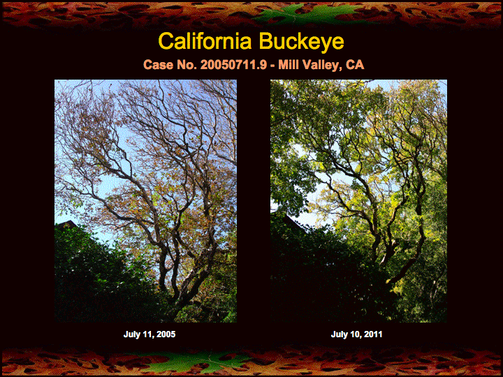 Six years ago these California buckeyes in Mill Valley were suffering from early leaf senescence. The owner wisely followed my fire mimicry protocol in treating the buckeyes, and six years later we see that the buckeyes are no longer experiencing early leaf senescence. As can be seen in results from these same trees posted from year 4 and year 5, these buckeyes have not been experiencing early leaf senescence for the past 3 years.