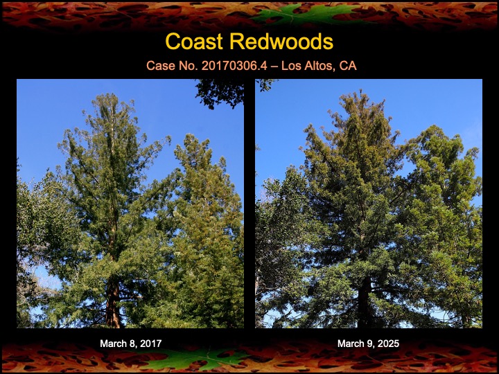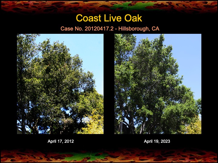 Seven years ago I began fire mimicry treatments on four coast live oaks, as well as two redwood trees in Los Altos, CA. I reported on the progress of these trees back in 2020.and in 2018. For obvious reasons, the property owner has asked me to continue treating these trees, so they have received five treatments over the past seven years. These results tend to support my intuition that when trees have not responded to my treatments, it is likely because I did not do enough care, rather than having done too much.