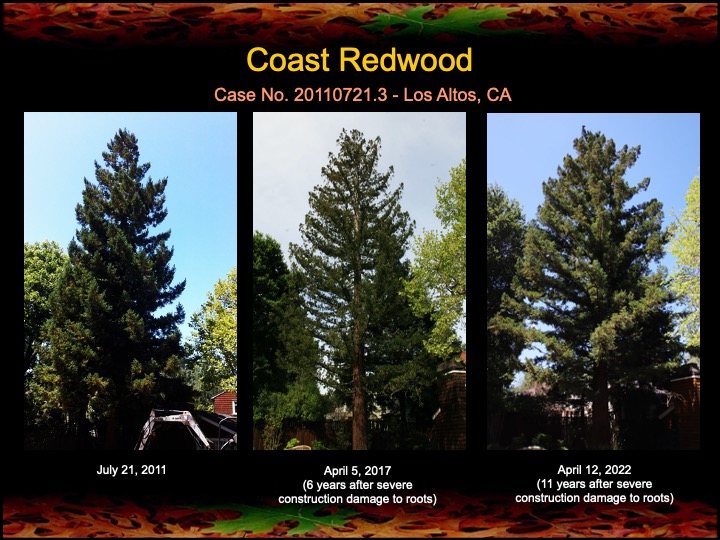 I’m often asked whether trees can withstand root amputation by construction activities. Generally, I’ve found that if the trees are tended with fire mimicry beforehand, there is a better chance of their survival. Above is an example of a redwood tree in Los Altos, CA that was treated with fire mimicry before and after construction damage. While the redwood suffered some canopy loss after construction, it has recovered and is now thriving!