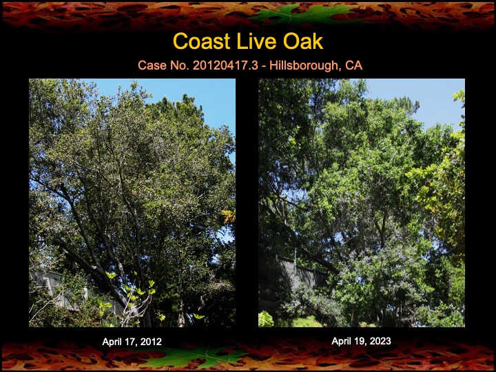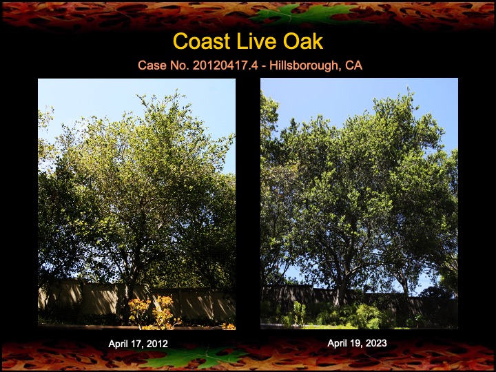 Seven years ago I began fire mimicry treatments on four coast live oaks, as well as two redwood trees in Los Altos, CA. I reported on the progress of these trees back in 2020.and in 2018. For obvious reasons, the property owner has asked me to continue treating these trees, so they have received five treatments over the past seven years. These results tend to support my intuition that when trees have not responded to my treatments, it is likely because I did not do enough care, rather than having done too much.